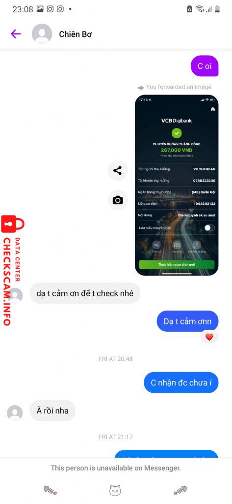 Cảnh báo kẻ lừa đảo: Vũ Thị Ngân Đã báo cáo: November 16, 2024 Thông tin kẻ lừa đảo Họ và tên: Vũ Thị Ngân Cổng thanh toán: MB Bank Tài khoản thanh toán: 0788222348 Danh mục: Lừa đảo mua bán Nguồn: Checkscam Tệp bằng chứng Mô tả báo cáo Bình luận Bình luận của bạn Thêm bình luận Chưa có bình luận nào. Hãy là người đầu tiên chia sẻ kinh nghiệm của bạn với kẻ lừa đảo này.