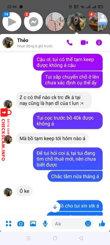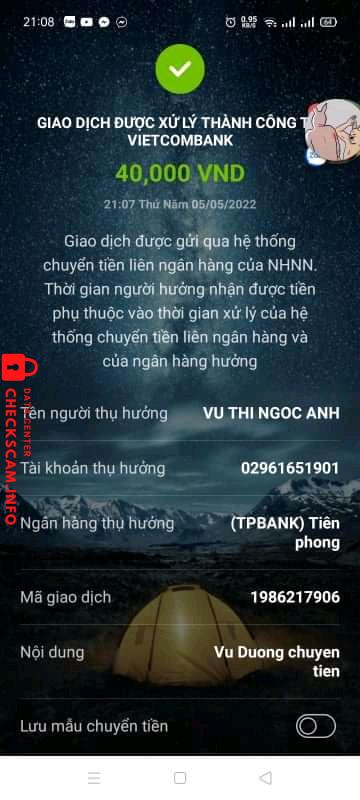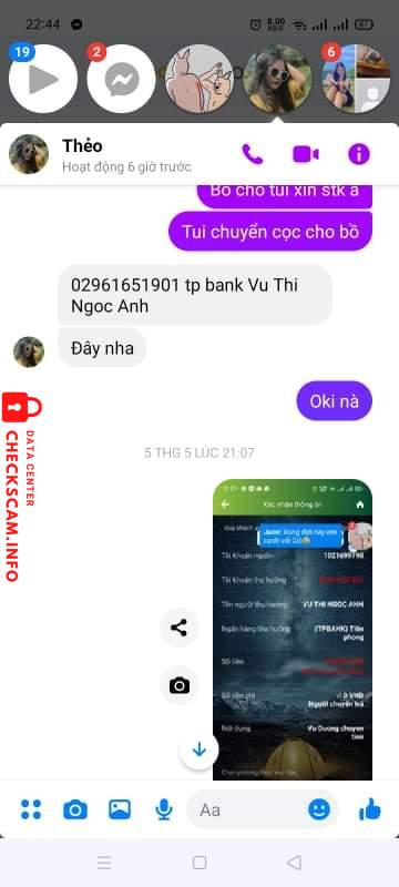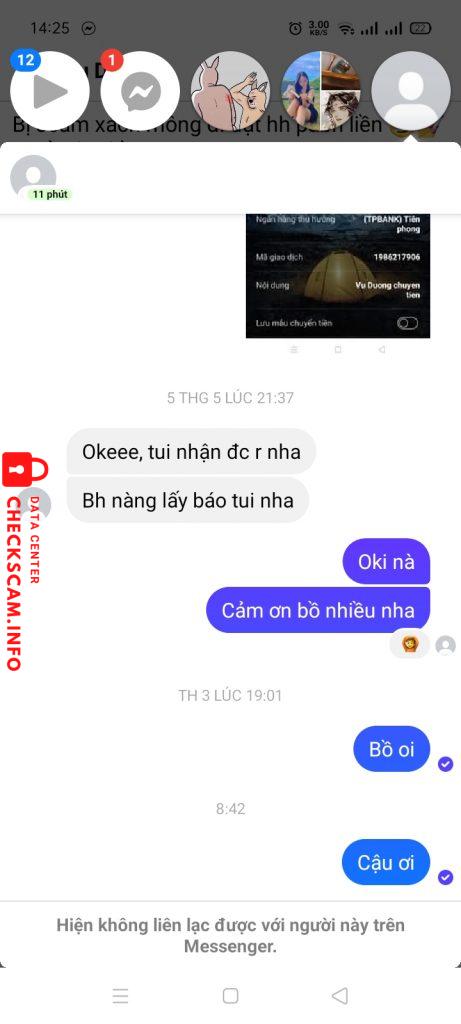 Cảnh báo kẻ lừa đảo: Vu Thi Ngoc Anh Đã báo cáo: November 16, 2024 Thông tin kẻ lừa đảo Họ và tên: Vu Thi Ngoc Anh Cổng thanh toán: TPBank Tài khoản thanh toán: 02961651901 Danh mục: Lừa đảo mua bán Nguồn: Checkscam Tệp bằng chứng Mô tả báo cáo Lừa đảo rao bán sách, lừa tiền chiếm đoạt tài sản Bình luận Bình luận của bạn Thêm bình luận Chưa có bình luận nào. Hãy là người đầu tiên chia sẻ kinh nghiệm của bạn với kẻ lừa đảo này.