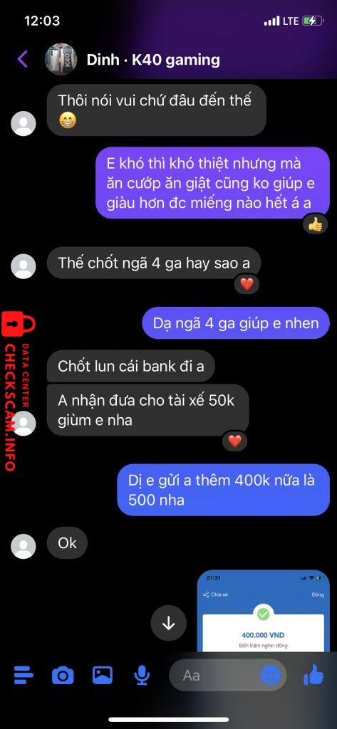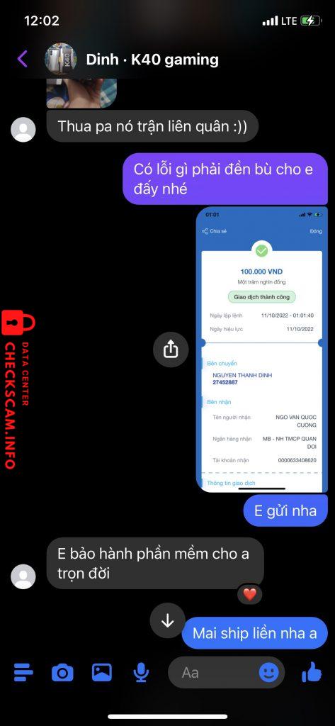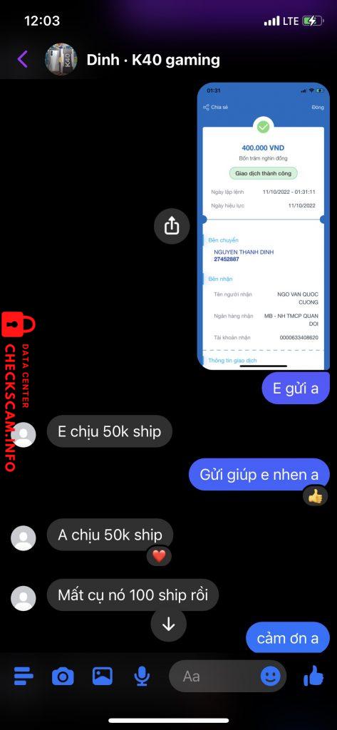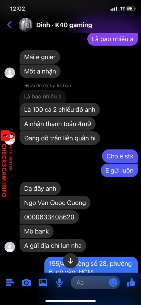 诈骗者警报: NGÔ VĂN QUỐC CƯỜNG 已报告: November 16, 2024 诈骗者信息 全名: NGÔ VĂN QUỐC CƯỜNG 支付网关: MB Bank 支付账户: 0000633408620 类别: 市场诈骗 来源: Checkscam 证据文件 报告描述 lừa đảo tiền cọc mua đt 评论 您的评论 添加评论 暂无评论。成为第一个分享您与此诈骗者经历的人。
