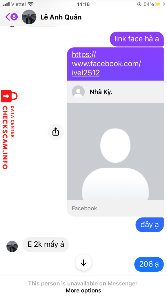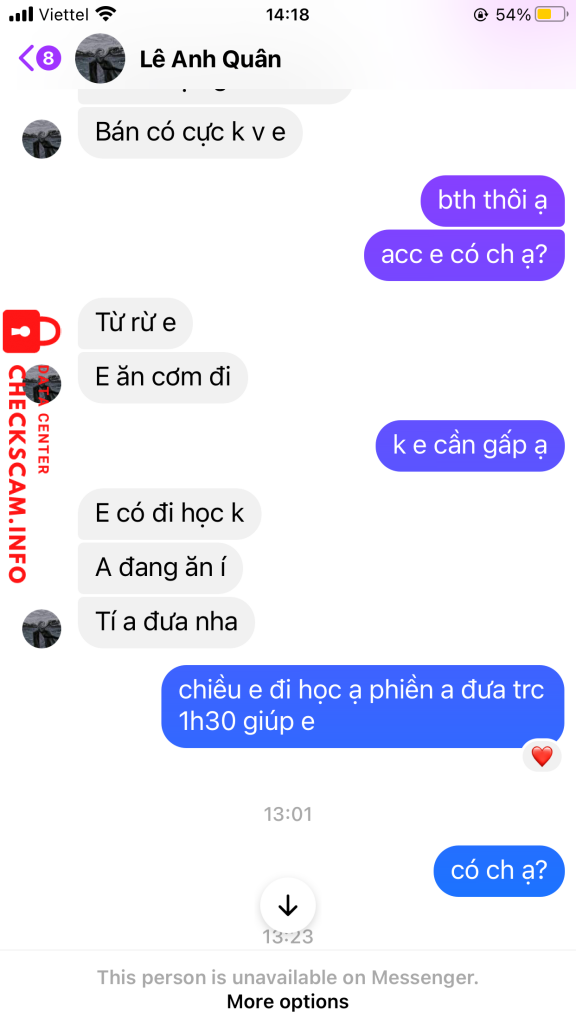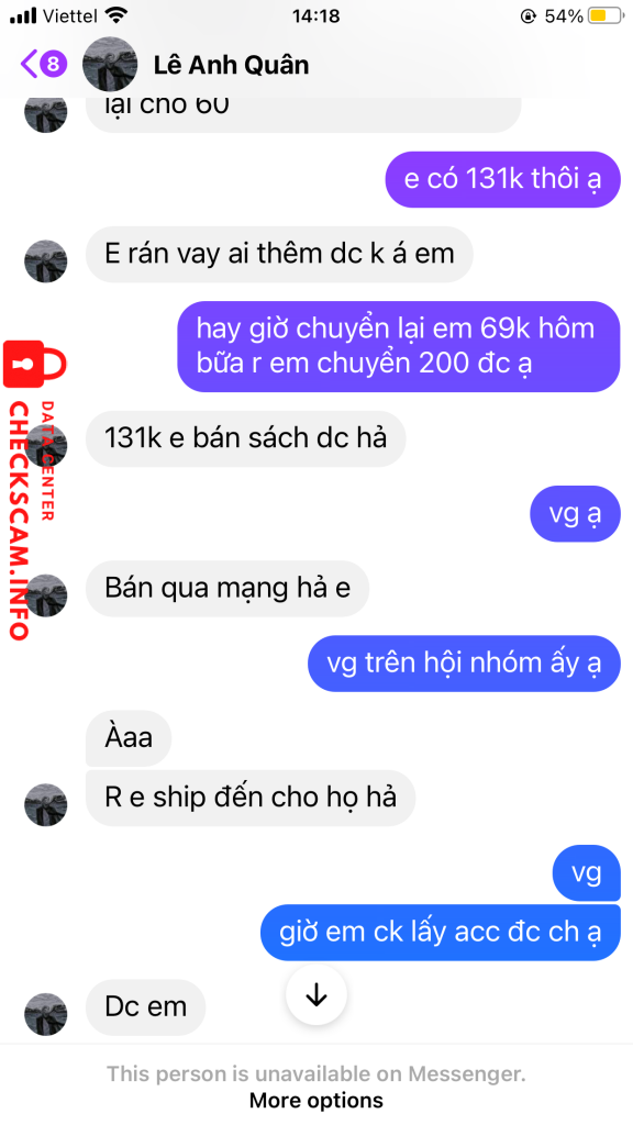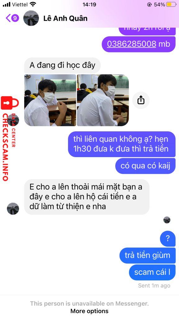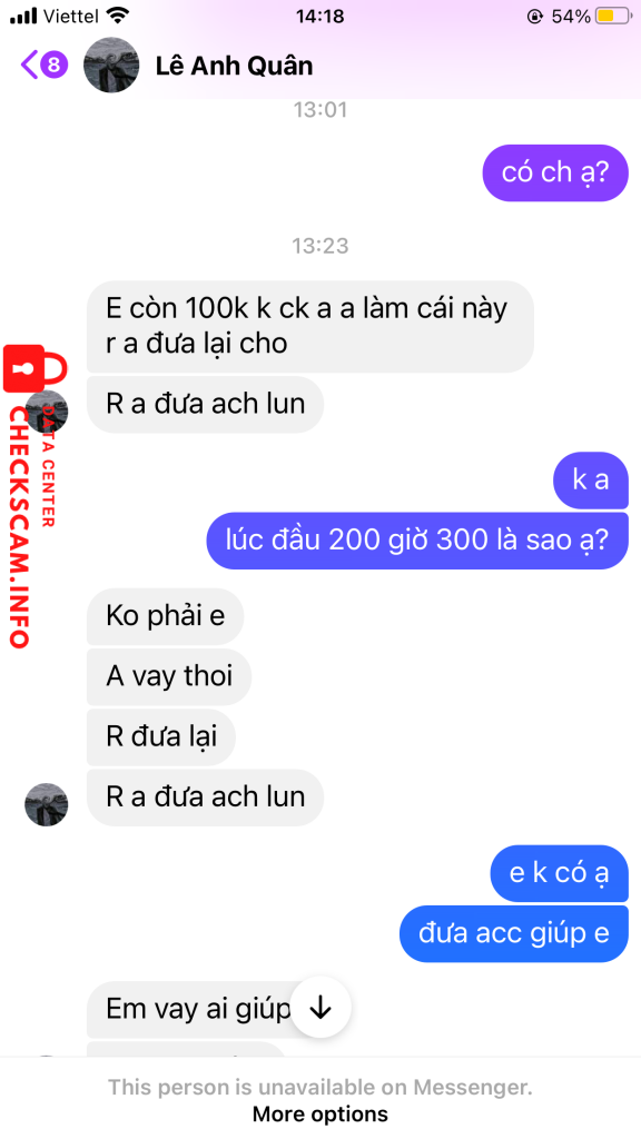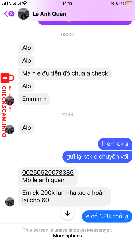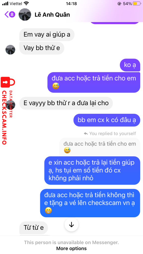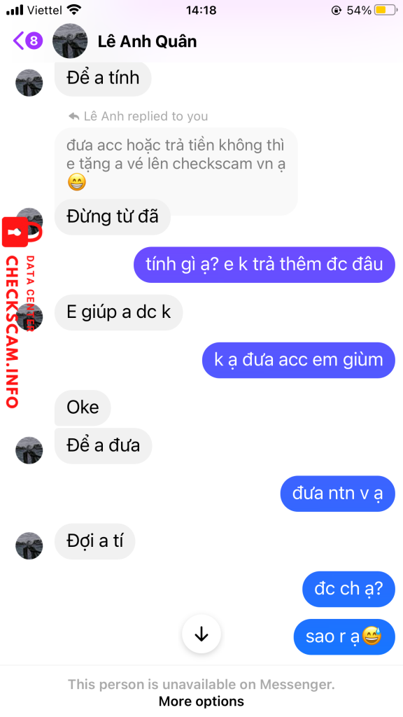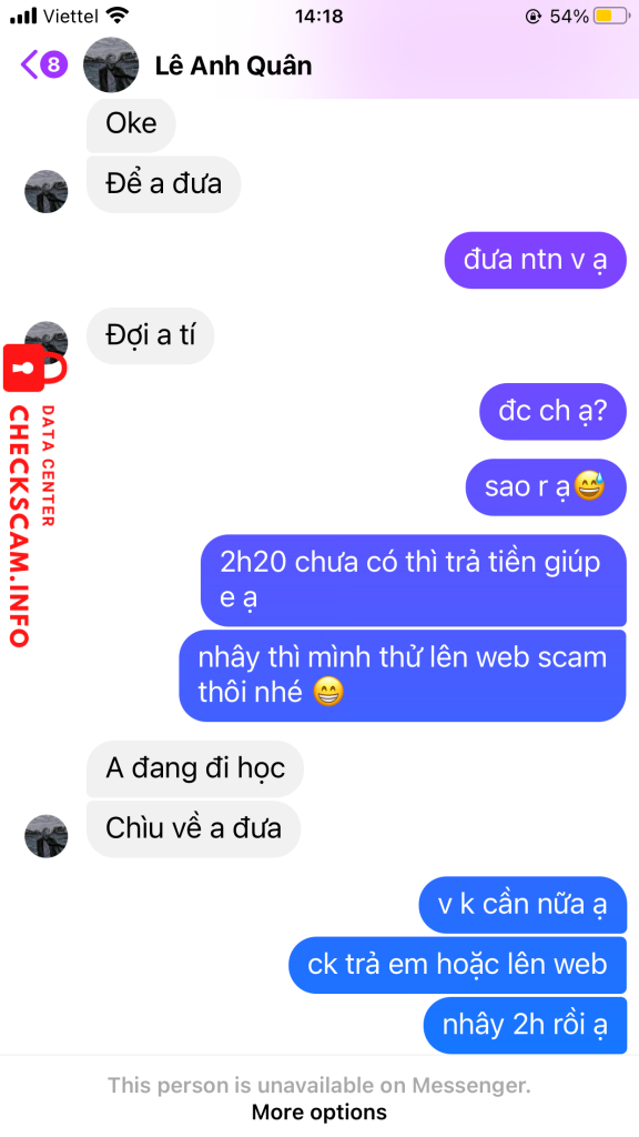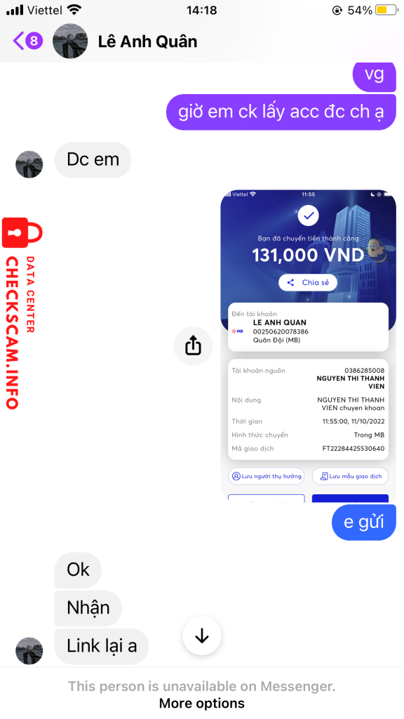 诈骗者警报: lê anh quân 已报告: November 16, 2024 诈骗者信息 全名: lê anh quân 支付网关: mb bank 支付账户: 00250620078386 类别: 市场诈骗 来源: Checkscam 证据文件 报告描述 scam ncc đm 评论 您的评论 添加评论 暂无评论。成为第一个分享您与此诈骗者经历的人。