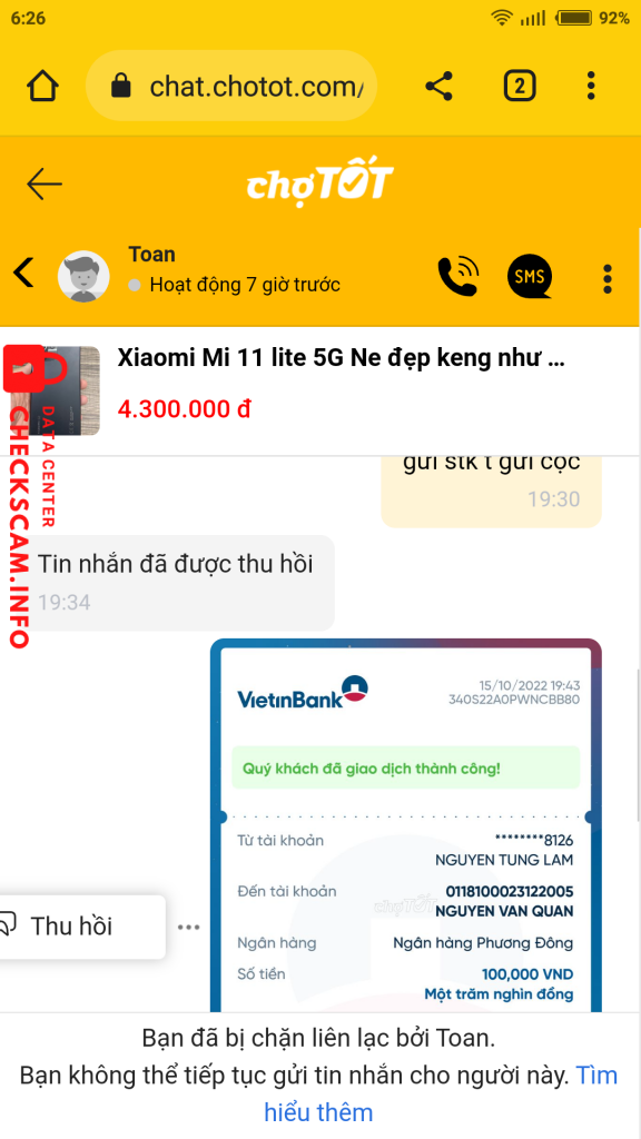 诈骗者警报: Nguyen van quan 已报告: November 16, 2024 诈骗者信息 全名: Nguyen van quan 支付网关: Scb 支付账户: 0118100023122005 类别: 市场诈骗 来源: Checkscam 证据文件 报告描述 Bán điện thoại đòi cọc. Sau khi chuyển khoản cọc thì chặn người mua mà không gửi hàng. 评论 您的评论 添加评论 暂无评论。成为第一个分享您与此诈骗者经历的人。