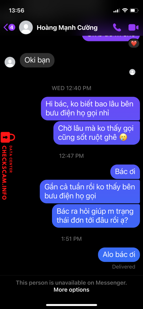 诈骗者警报: Hoàng Mạnh Cường 已报告: November 16, 2024 诈骗者信息 全名: Hoàng Mạnh Cường 支付网关: MBBank 支付账户: 015112001 类别: 市场诈骗 来源: Checkscam 证据文件 报告描述 Lừa trên hội nhóm mua bán máy game 评论 您的评论 添加评论 暂无评论。成为第一个分享您与此诈骗者经历的人。