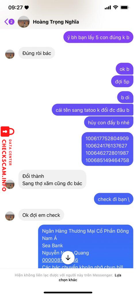 诈骗者警报: Hoàng Trọng Nghĩa 已报告: November 16, 2024 诈骗者信息 全名: Hoàng Trọng Nghĩa 电话号码: 0348649924 支付网关: MB bank 支付账户: 0184095997641 类别: 市场诈骗 来源: Checkscam 证据文件 报告描述 Thằng này scam nhé bà con , Mua Page của mình xong chặn luôn ko trả tiền 评论 您的评论 添加评论 暂无评论。成为第一个分享您与此诈骗者经历的人。
