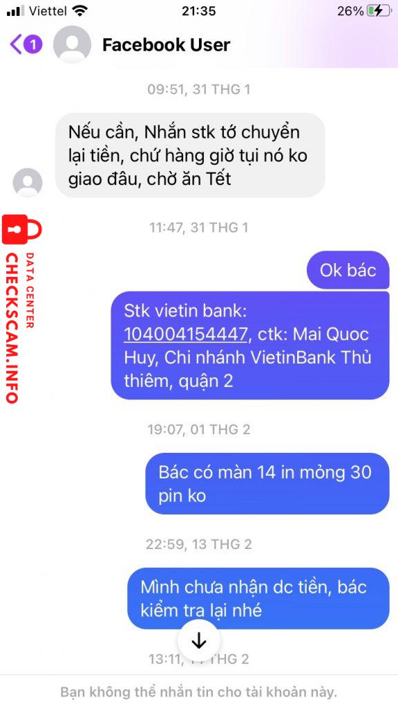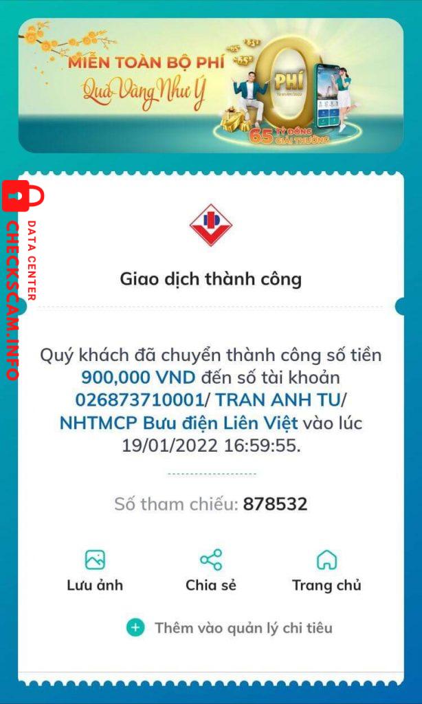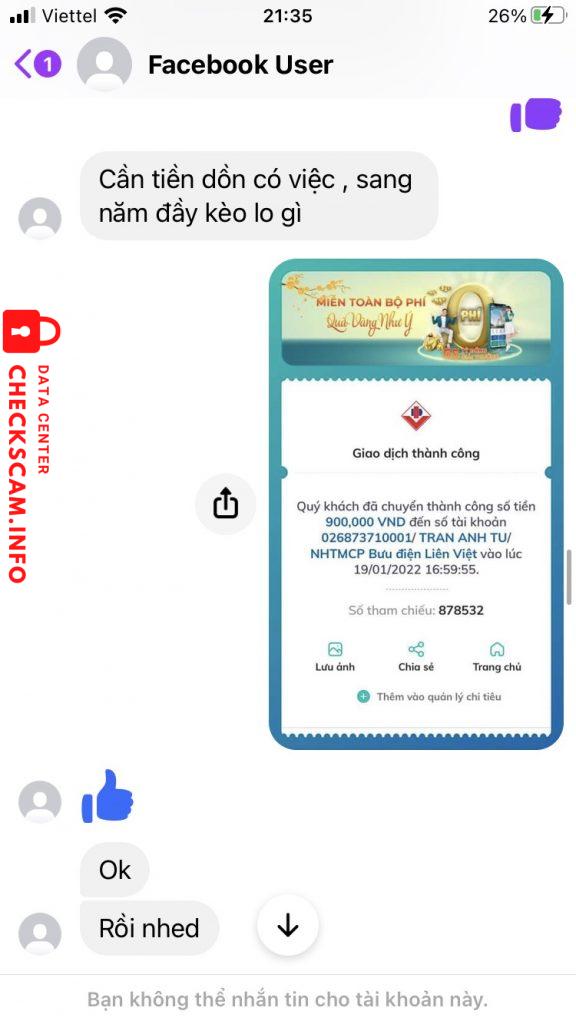 诈骗者警报: TRAN ANH TU 已报告: November 16, 2024 诈骗者信息 全名: TRAN ANH TU 支付网关: LienVietPostBank 支付账户: 026873710001 类别: 市场诈骗 来源: Checkscam 证据文件 报告描述 Đã nhận tiền bán máy laptop Lenovo Thinkpad T420 900.000 VNĐ nhưng không chuyển máy. 评论 您的评论 添加评论 暂无评论。成为第一个分享您与此诈骗者经历的人。