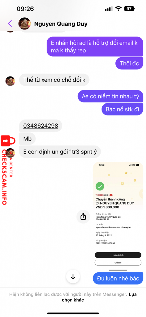 诈骗者警报: Nguyễn Quang Duy 已报告: November 16, 2024 诈骗者信息 全名: Nguyễn Quang Duy 电话号码: 0348624298 支付网关: Ngân hàng TMCP Quân Đội (MB) 支付账户: 0348624298 类别: 市场诈骗 来源: Checkscam 证据文件 报告描述 Mình mua tài khoản Phường Táo là tài khoản dùng cho việc kiểm tra thông tin iphone, unlock iphone. Qua nhóm fb, thấy bạn Duy có nhu cầu bán tài khoản, mình đã mua và thực hiện chuyển khoản cho bạn Duy. Hiện bạn ấy đã đổi mật khẩu và chặn chat 评论 您的评论 添加评论 暂无评论。成为第一个分享您与此诈骗者经历的人。