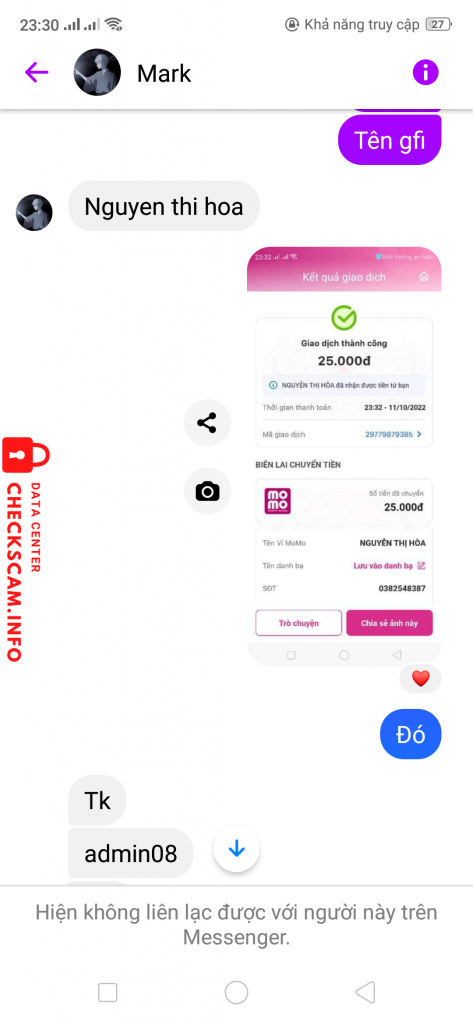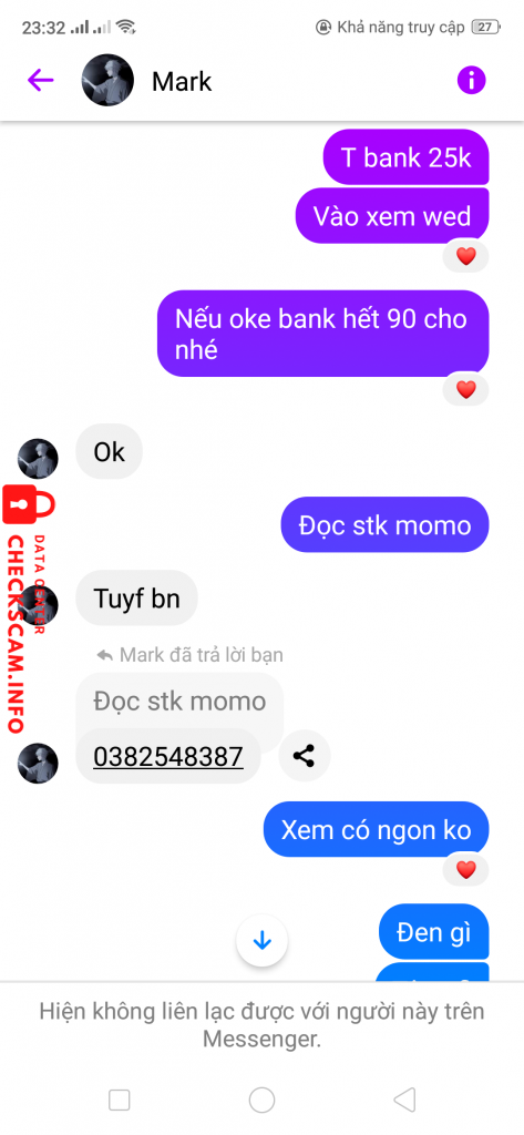 诈骗者警报: Nguyễn Thị Hòa 已报告: November 16, 2024 诈骗者信息 全名: Nguyễn Thị Hòa 电话号码: 0382548387 支付网关: Momo 支付账户: 0382548387 类别: 市场诈骗 来源: Checkscam 证据文件 报告描述 Bán wed buff sud scam 评论 您的评论 添加评论 暂无评论。成为第一个分享您与此诈骗者经历的人。