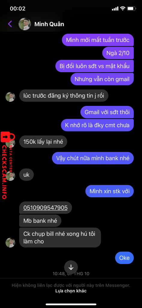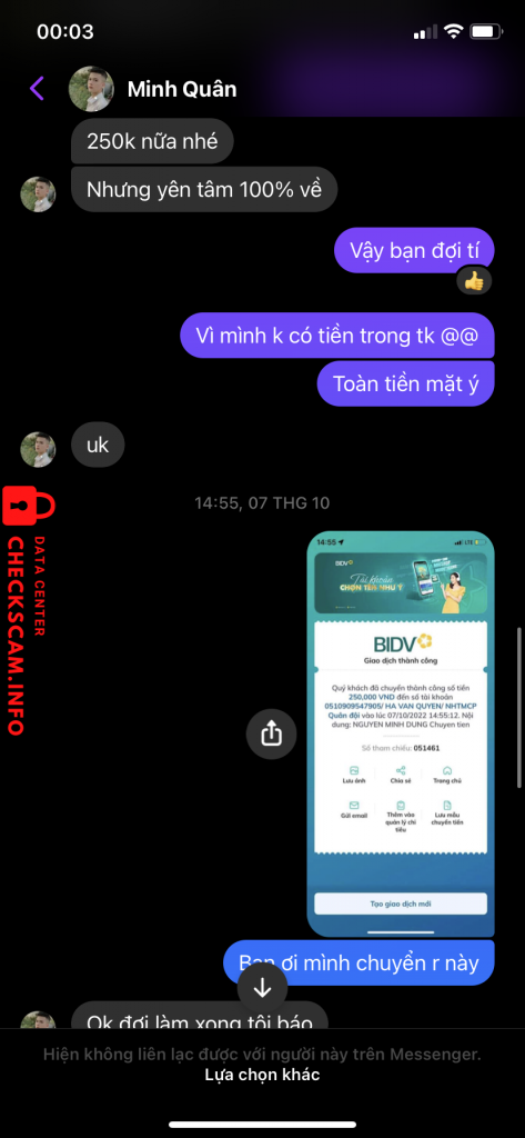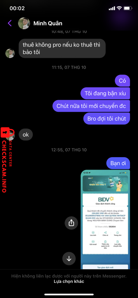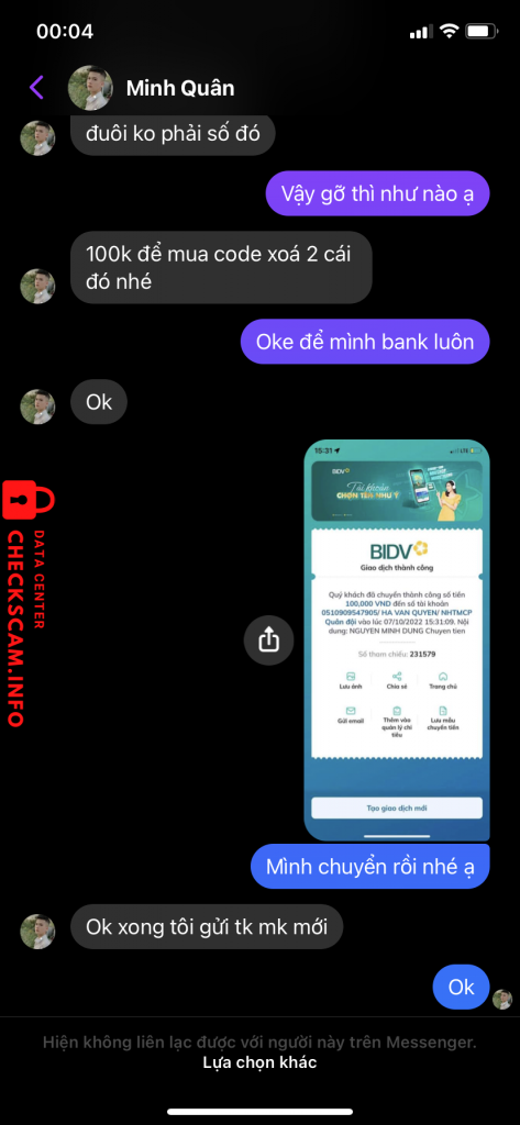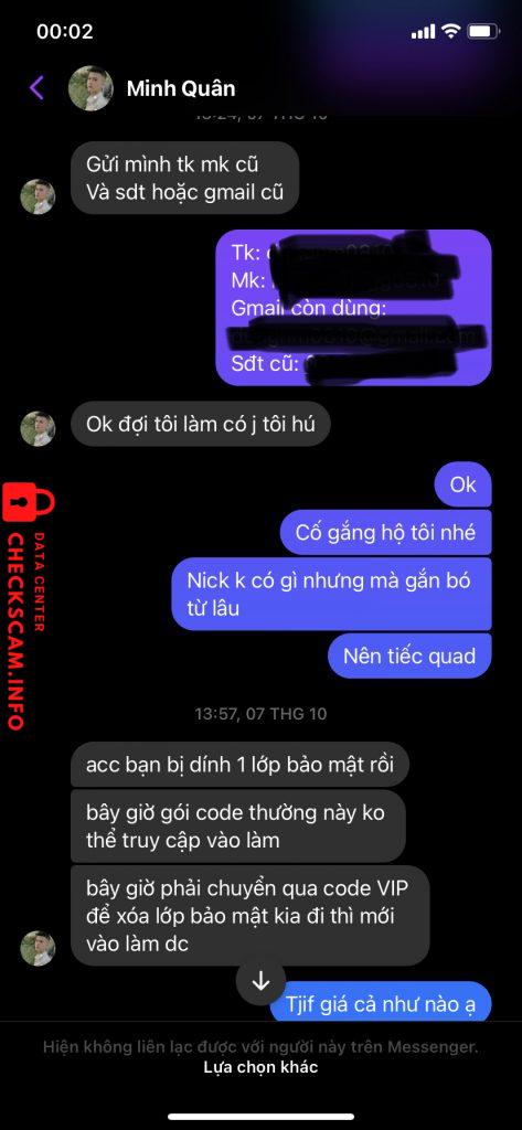 诈骗者警报: HA VAN QUYEN 已报告: November 16, 2024 诈骗者信息 全名: HA VAN QUYEN 支付网关: MB bank 支付账户: 0510909547905 类别: 市场诈骗 来源: Checkscam 证据文件 报告描述 Vào ngày 7-10-2022, t đã liên lạc với bạn này với mong muốn bạn này giúp lấy lại tài khoản game với sự chắc chắn của bạn. Sau đó bạn này có block t và không làm việc nữa 评论 您的评论 添加评论 暂无评论。成为第一个分享您与此诈骗者经历的人。