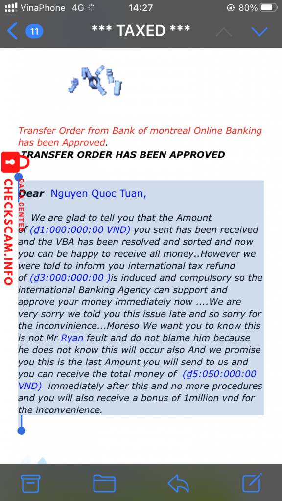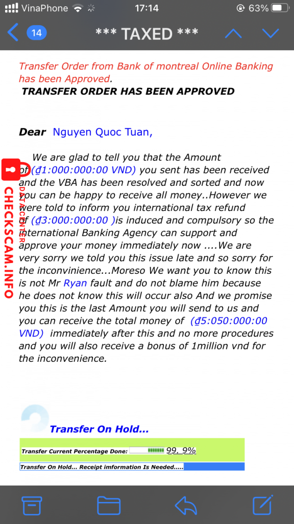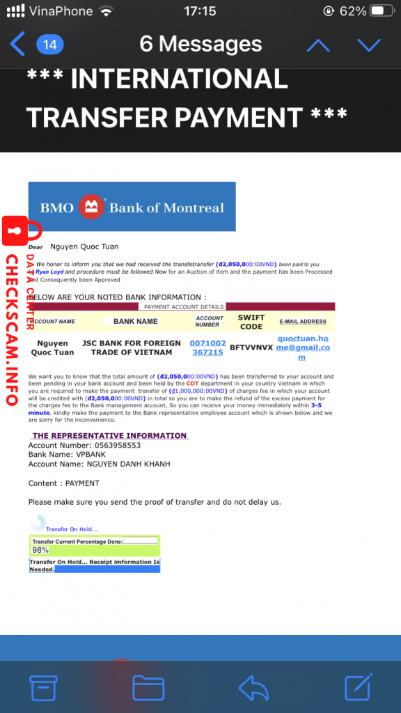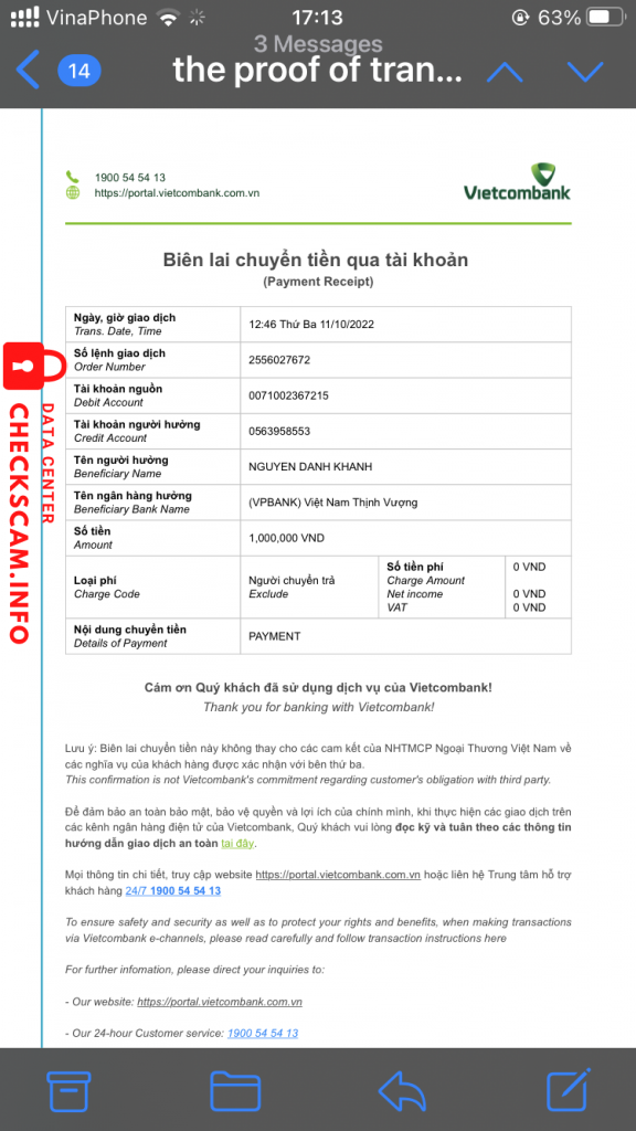 诈骗者警报: NGUYEN DANH KHANH 已报告: November 16, 2024 诈骗者信息 全名: NGUYEN DANH KHANH 支付网关: VIB 支付账户: 0563958553 类别: 市场诈骗 来源: Checkscam 证据文件 报告描述 Đối tượng giả người nước ngoài hỏi mua hàng, sau đó giả dã chuyển tiền nhưng dư. Yêu cầu chuyển lại tiền thừa đối tượng khác có tài khoản của VIB để nhận. Số tk VIB là NGUYEN DANH KHANH – 0563958553 评论 您的评论 添加评论 暂无评论。成为第一个分享您与此诈骗者经历的人。