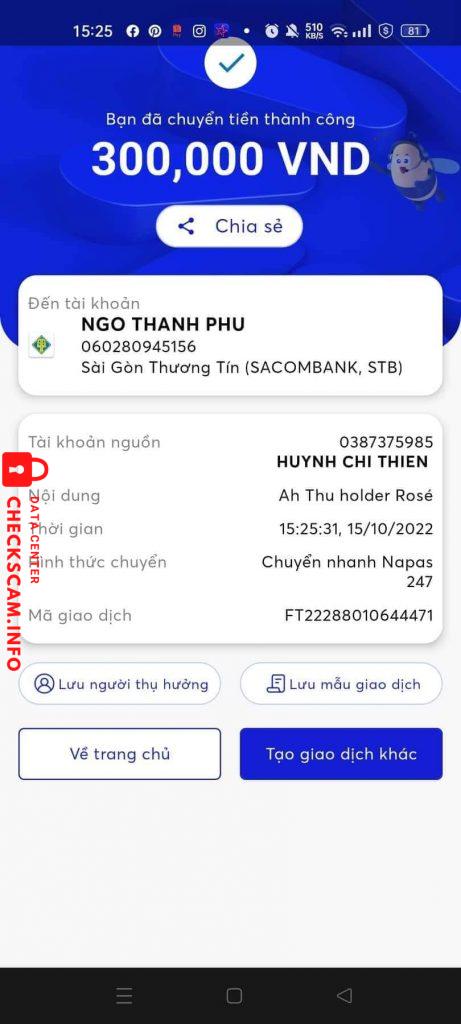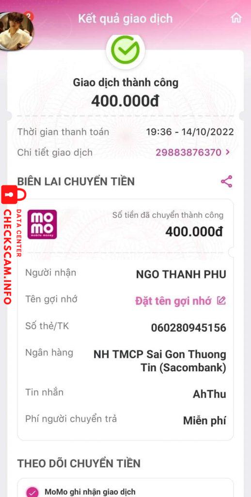 诈骗者警报: Ngo Thanh Phu 已报告: November 16, 2024 诈骗者信息 全名: Ngo Thanh Phu 支付网关: Sacombank 支付账户: 060280945156 类别: 市场诈骗 来源: Checkscam 证据文件 报告描述 Scam tinh vi ăn cắp tt của ng khác 评论 您的评论 添加评论 暂无评论。成为第一个分享您与此诈骗者经历的人。