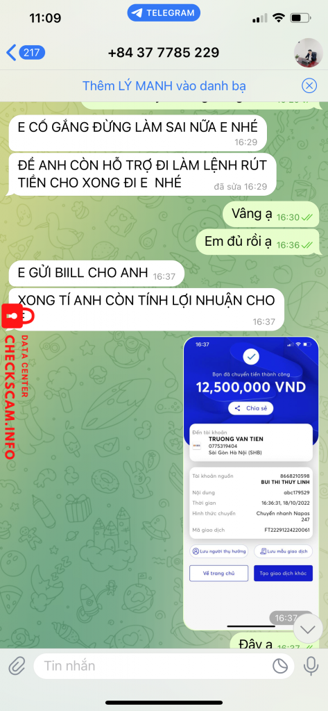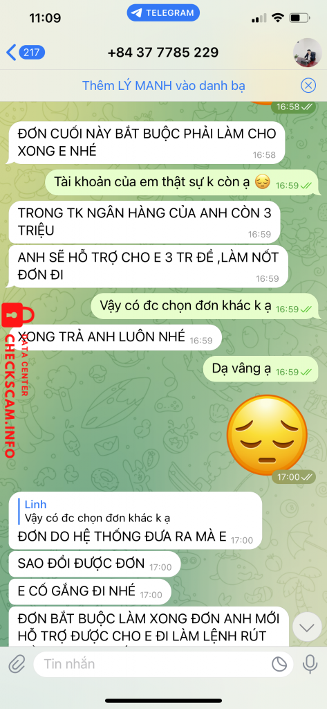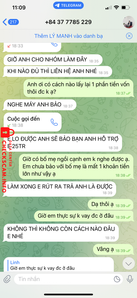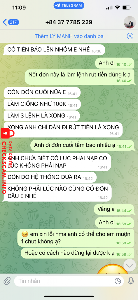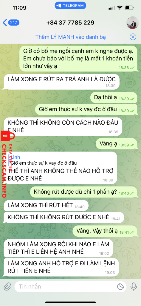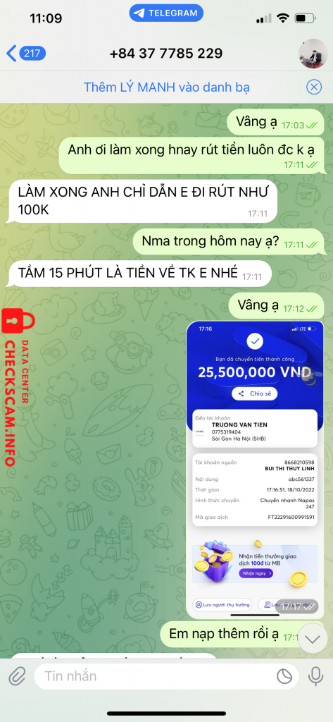 Tôi bị lừa khi tìm việc trên web vieclam24h. Tôi có apply CV lên đó và được 1 người tên Hà Linh tự nhận là nhân sự, gọi điện hẹn pv. Sau đó người này giới thiệu công việc, nói là hỗ trợ bộ phận khác của công ty. Đúng giờ, bên họ mời tôi tham gia vào nhóm Telegram, làm các nhiệm vụ. Lúc đầu chỉ là tải các app, sau phải nạp tiền vào các đơn lợi nhuận. 500k, 800k, 3tr, 6tr, 25tr, 75tr,… vào tài khoản minhngocc789.com. Nhóm được điều khiển bởi người tên Lý Mạnh Trường. Anh Trường sau khi thấy tôi không đủ điều kiện tham gia tiếp có đề nghị cho tôi vay 25tr và nói sau khi làm nốt lệnh cuối sẽ được hướng dẫn lệnh rút tiền. Cuối cùng, tổng số tiền tôi chuyển cho bên đó là 40tr700