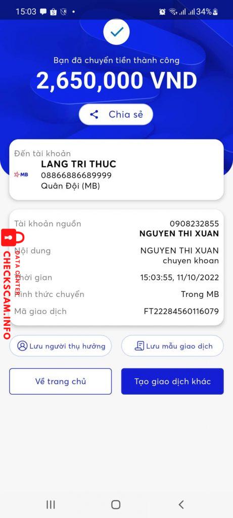 诈骗者警报: LANG TRI THUC 已报告: November 16, 2024 诈骗者信息 全名: LANG TRI THUC 电话号码: 0344720960 支付网关: Ngân hàng Quân đội (MB Bank) 支付账户: 08866886689999 类别: 市场诈骗 来源: Checkscam 证据文件 报告描述 Lừa đảo, loại cặn bã của xã hội 评论 您的评论 添加评论 暂无评论。成为第一个分享您与此诈骗者经历的人。