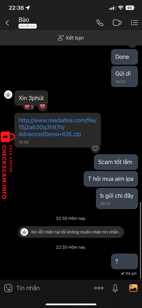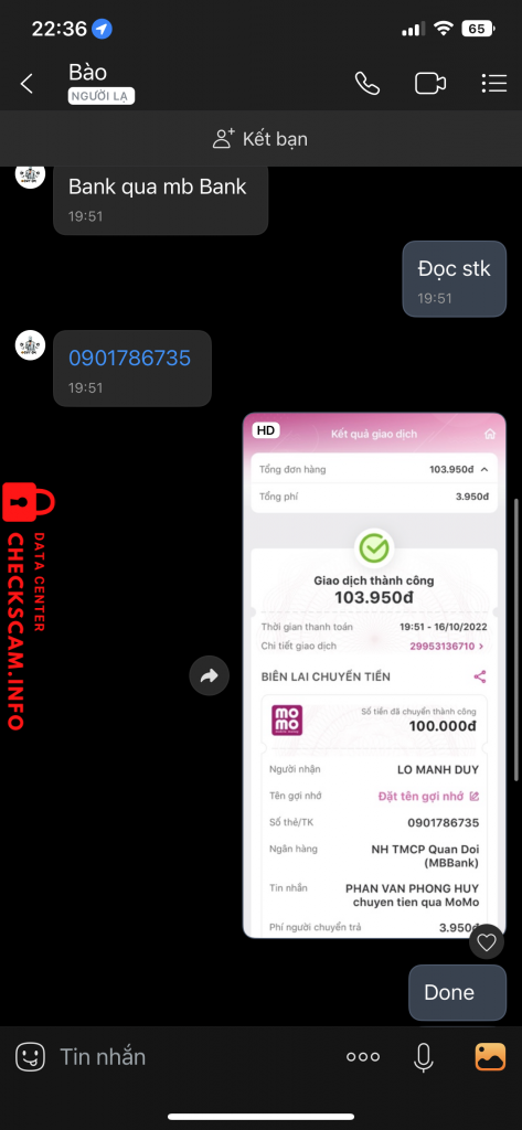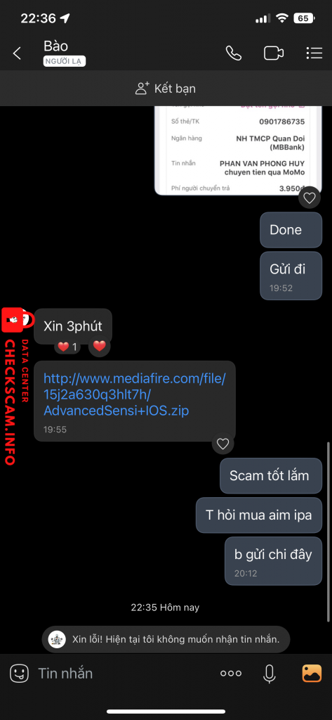 诈骗者警报: LO MANH DUY 已报告: November 16, 2024 诈骗者信息 全名: LO MANH DUY 电话号码: 0901786735 支付网关: MB BANK 支付账户: 0901786735 类别: 市场诈骗 来源: Checkscam 证据文件 报告描述 Mua aim ghim đầu gửi mấy video tăng độ nhạy máy nhảm xong block 评论 您的评论 添加评论 暂无评论。成为第一个分享您与此诈骗者经历的人。