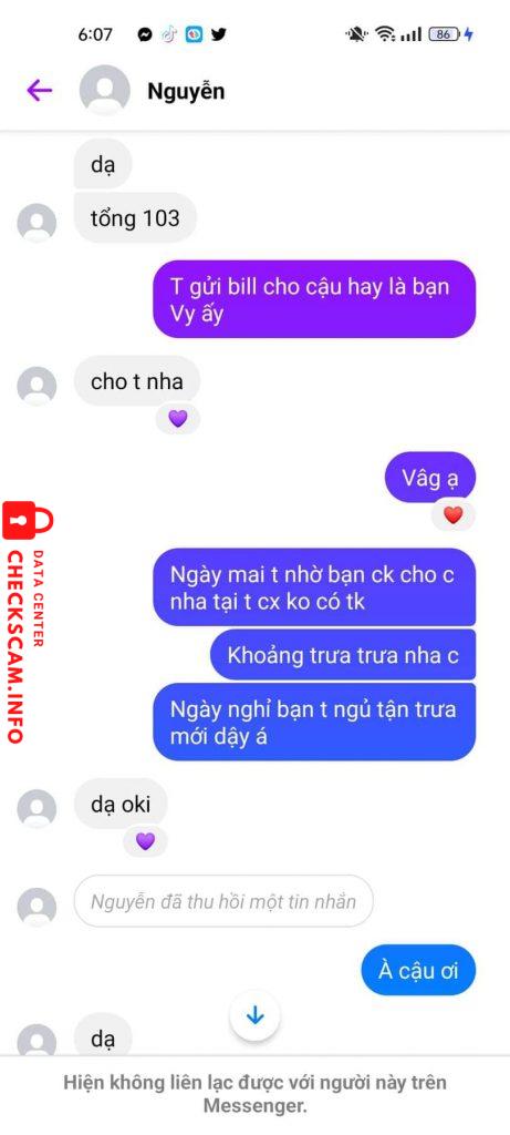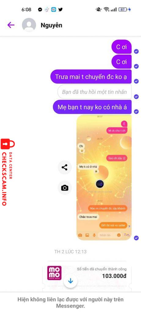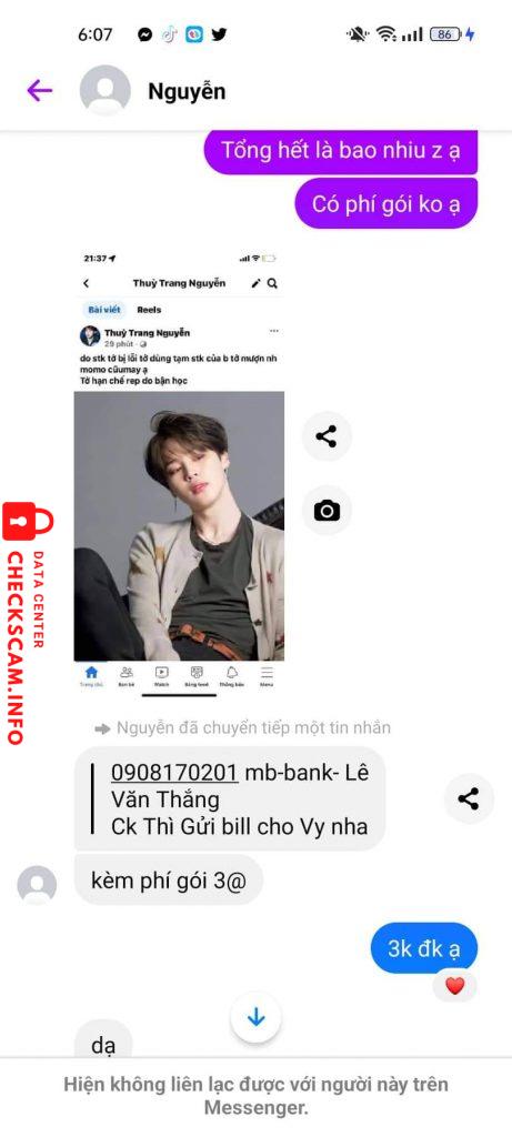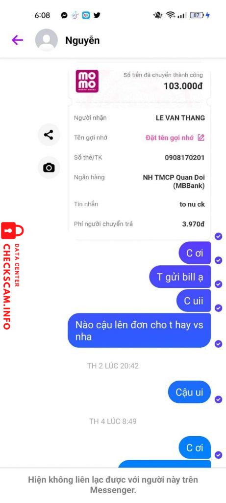 诈骗者警报: Lê Văn Thắng 已报告: November 16, 2024 诈骗者信息 全名: Lê Văn Thắng 支付网关: MB Bank 支付账户: 0908170201 类别: 市场诈骗 来源: Checkscam 证据文件 报告描述 Người mua chuyển khoản xong không check tin nhắn, 2 ngày sau block người mua 评论 您的评论 添加评论 暂无评论。成为第一个分享您与此诈骗者经历的人。