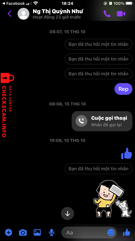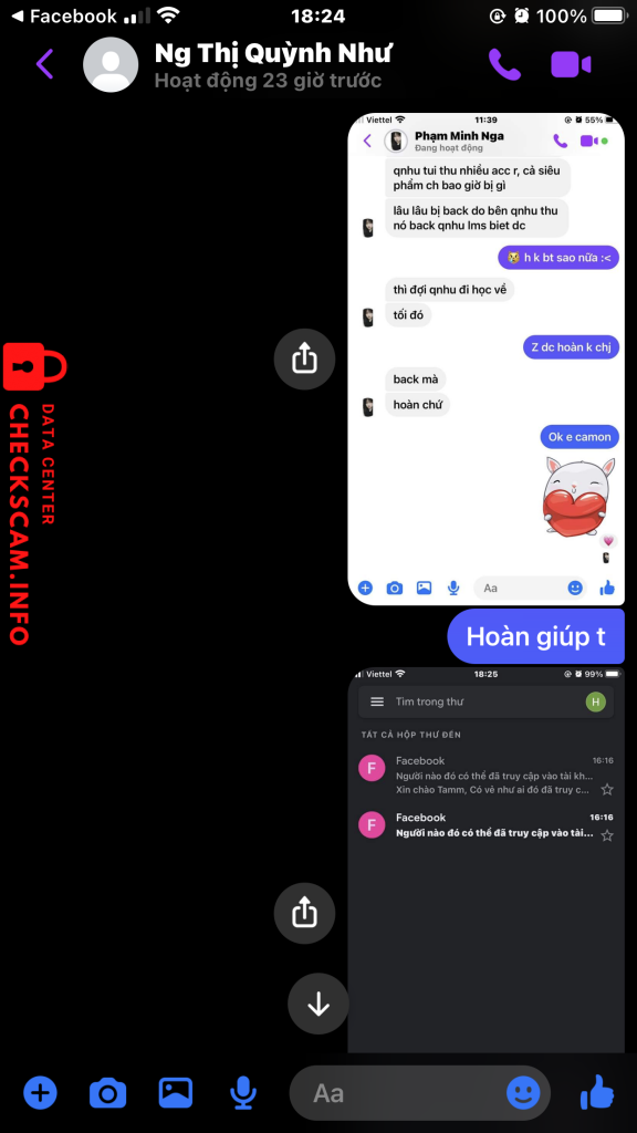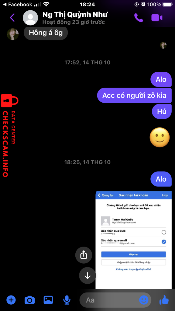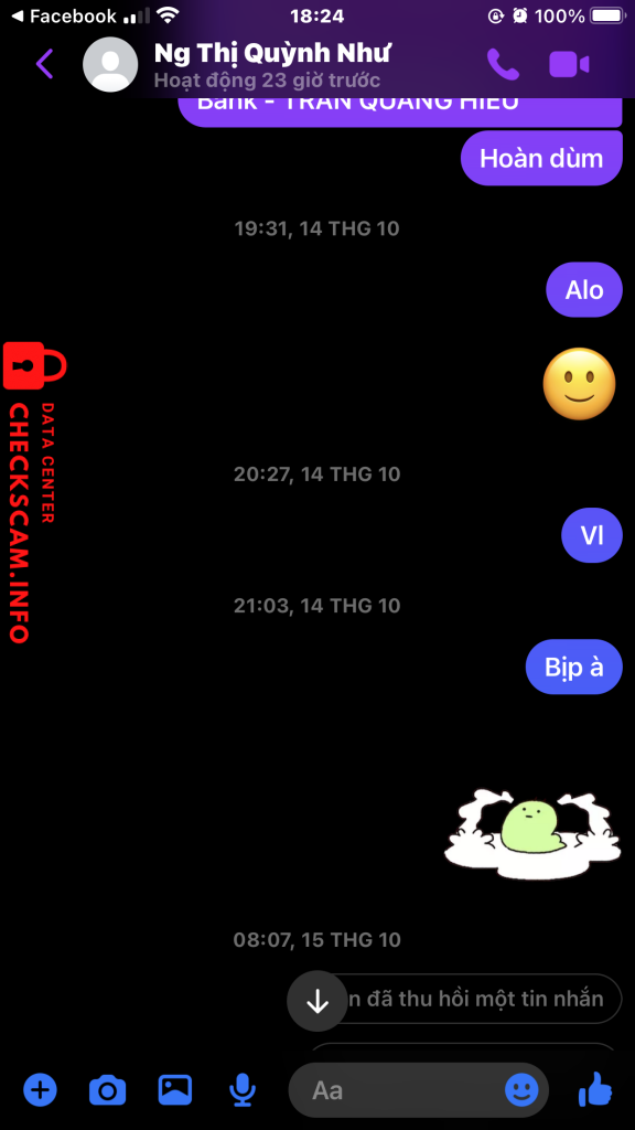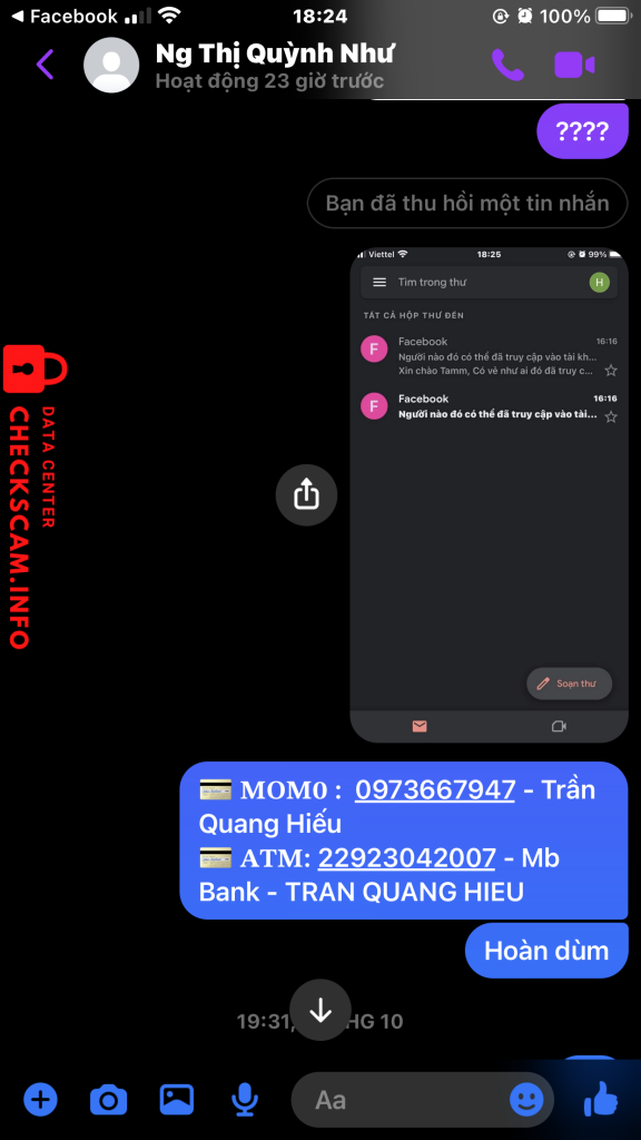 诈骗者警报: Nguyễn Thị Quỳnh Như 已报告: November 16, 2024 诈骗者信息 全名: Nguyễn Thị Quỳnh Như 电话号码: 0365277514 社交媒体链接: https://www.facebook.com/qn.1230 支付网关: Mb Bank 支付账户: 09771407777 类别: 市场诈骗 来源: Checkscam 证据文件 报告描述 Bán acc bao back mà bị back ib k rep ( off từ 14/10 đến giờ k rep ) ( mua sáng chìu bị back ) Liên hệ zalo thì seen xong lock k rep Link Facebook scam : https://www.facebook.com/qn.1230 评论 您的评论 添加评论 暂无评论。成为第一个分享您与此诈骗者经历的人。