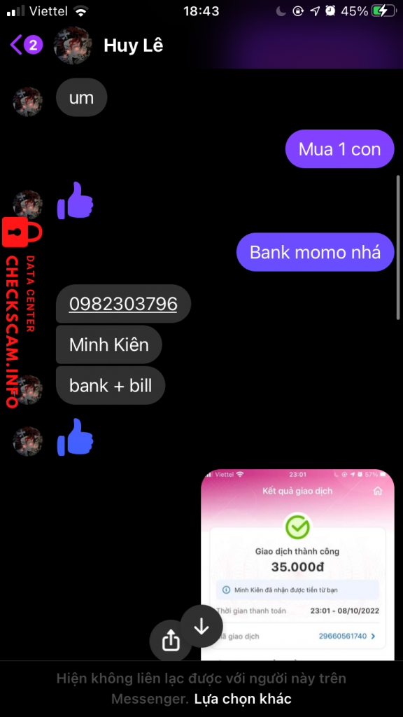 诈骗者警报: Minh Kiên 已报告: November 16, 2024 诈骗者信息 全名: Minh Kiên 电话号码: 0982303796 支付网关: momo 支付账户: 0982303796 类别: 市场诈骗 来源: Checkscam 证据文件 报告描述 Lừa đảo bán vps được 2 ngày die 评论 您的评论 添加评论 暂无评论。成为第一个分享您与此诈骗者经历的人。