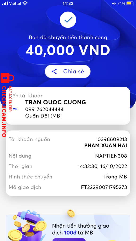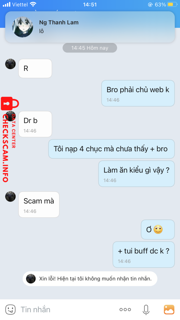 诈骗者警报: Trần Quốc Cường 已报告: November 16, 2024 诈骗者信息 全名: Trần Quốc Cường 电话号码: 0328024245 支付网关: MB BANK 支付账户: 0991762044444 类别: 市场诈骗 来源: Checkscam 证据文件 报告描述 Tôi chính là người bị nó scam mong ad web trả lại tiền cho em , và liên hệ zalo của e ạ . Cảm ơn ad checkscam 评论 您的评论 添加评论 暂无评论。成为第一个分享您与此诈骗者经历的人。