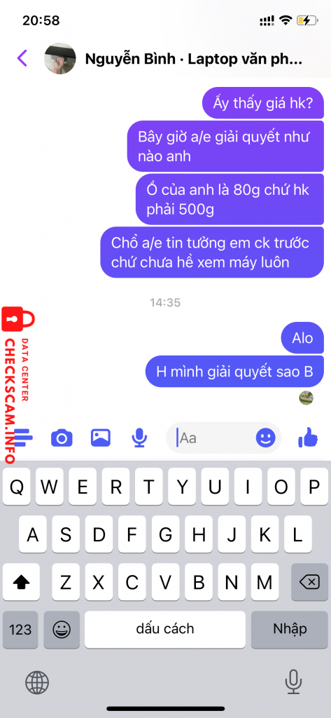 Tôi có đặt mua 1 laptop người bán đăng bán máy với cấu hình I5 5200U máy chạy ssd 128g đảm báo máy nguyên zin, nhưng khi gửi máy về máy đã tháo, ổ cứng là hdd 80g hk phải là ssd 128g như đã bán, gọi điện và nhắn tin cho người bán không trả lời, khônh chiệu trách nhiệm