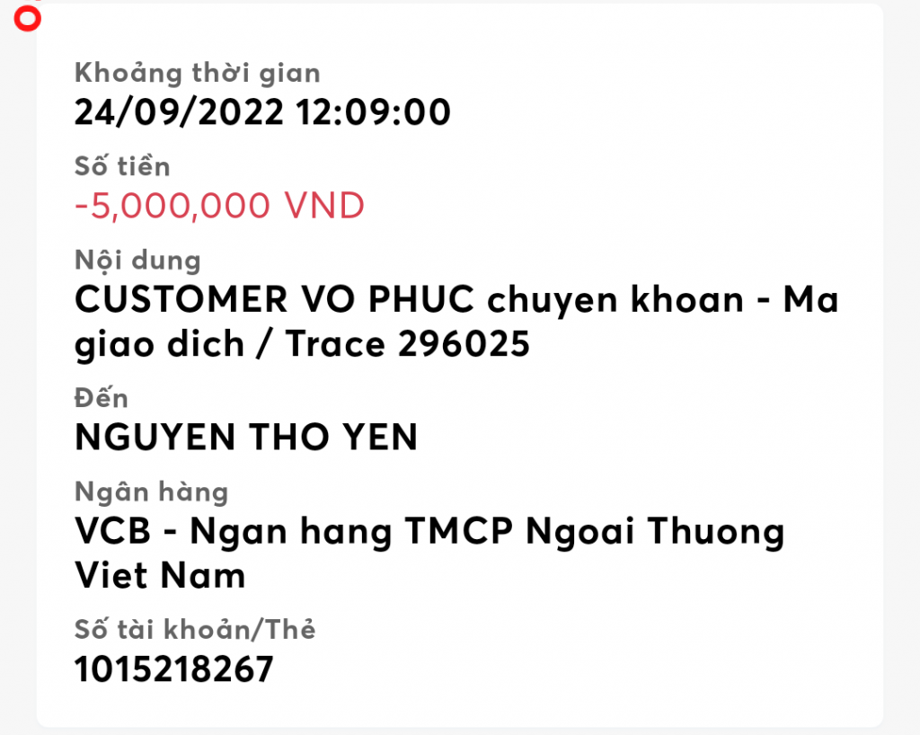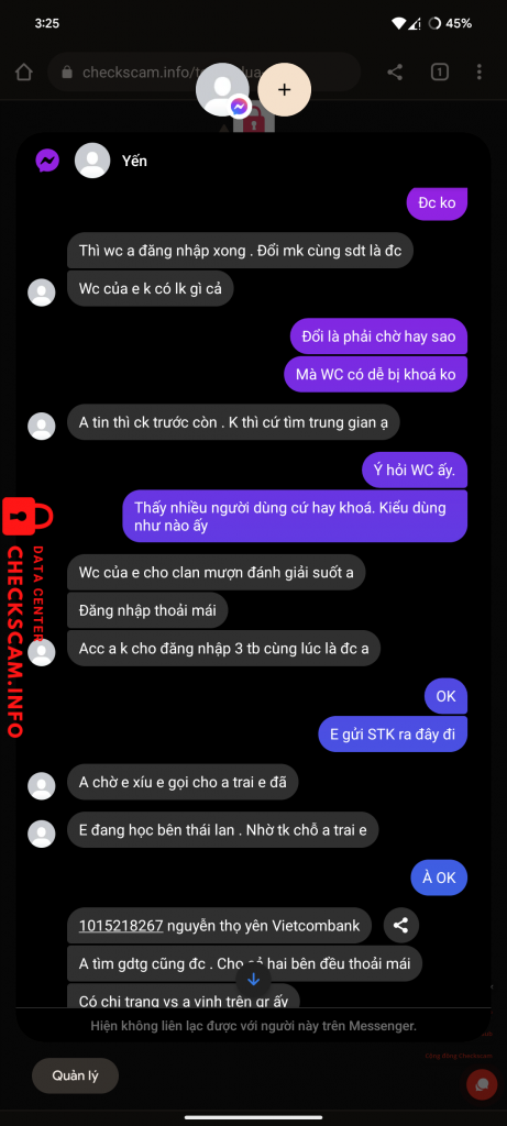 诈骗者警报: NGUYỄN THỌ YÊN 已报告: November 16, 2024 诈骗者信息 全名: NGUYỄN THỌ YÊN 电话号码: 0966582282 社交媒体链接: https://www.facebook.com/nguyenthoyen1993 支付网关: VIETCOMBANK 支付账户: 1015218267 类别: 市场诈骗 来源: Checkscam 证据文件 报告描述 Lừa bán cho mình 1 TK Wechat giá 5 Tr. Sau đó lấy lại TK rồi khoá Facebook và chặn liên lạc. Link Facebook: https://www.facebook.com/nguyenthoyen1993 Zalo: 0966582282 评论 您的评论 添加评论 暂无评论。成为第一个分享您与此诈骗者经历的人。