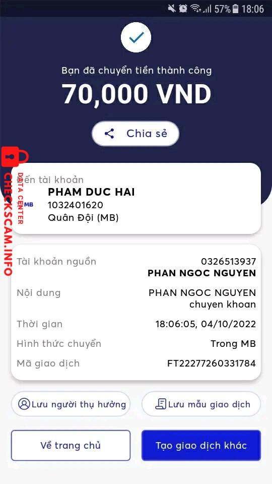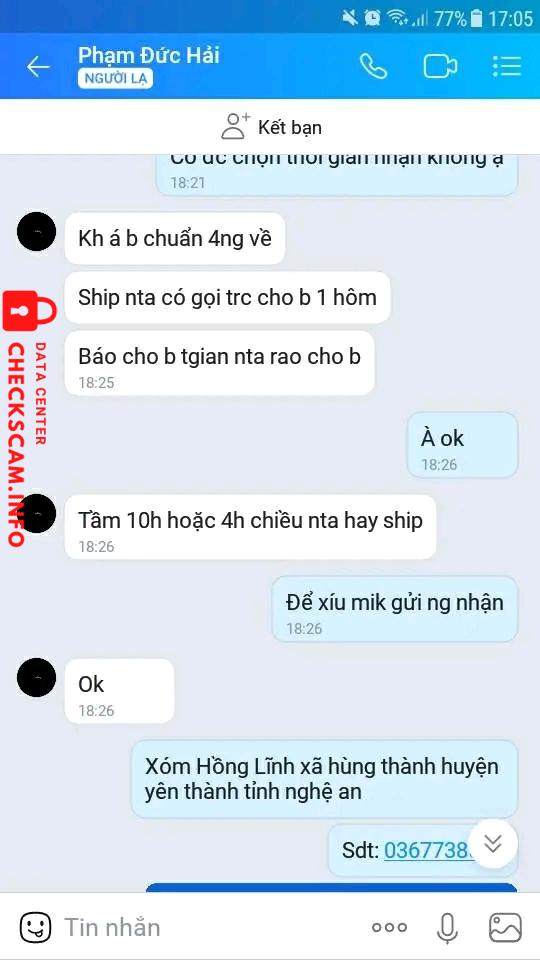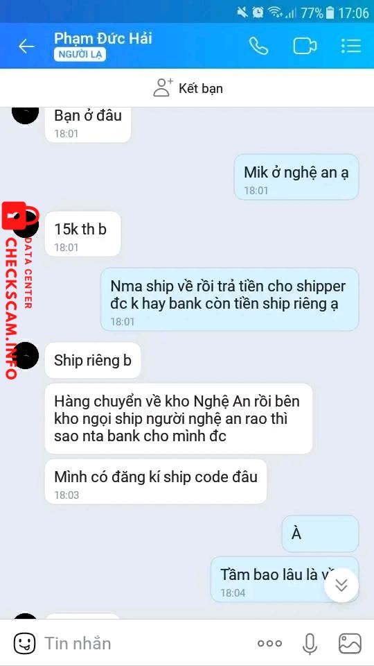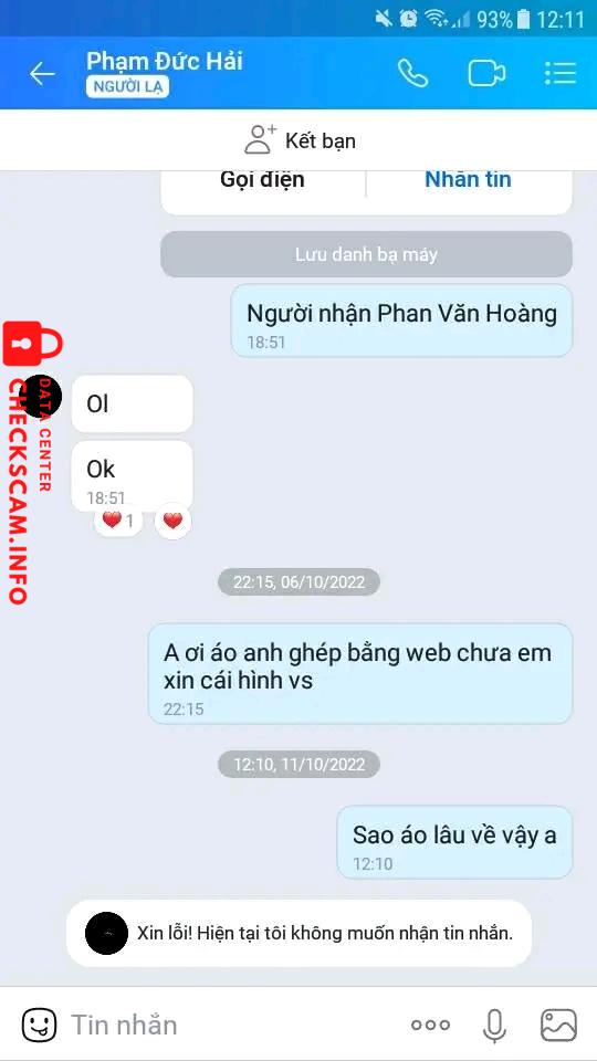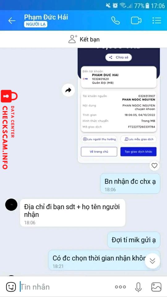 诈骗者警报: Phạm Đức Hải 已报告: November 16, 2024 诈骗者信息 全名: Phạm Đức Hải 电话号码: 1032401620 支付网关: MB bank 支付账户: 1032401620 类别: 市场诈骗 来源: Checkscam 证据文件 报告描述 Bán Áo Tricker Chuyển Tiền rồi bảo ship nhưng lại ko ship nhắn tin ko rep còn block 评论 您的评论 添加评论 暂无评论。成为第一个分享您与此诈骗者经历的人。