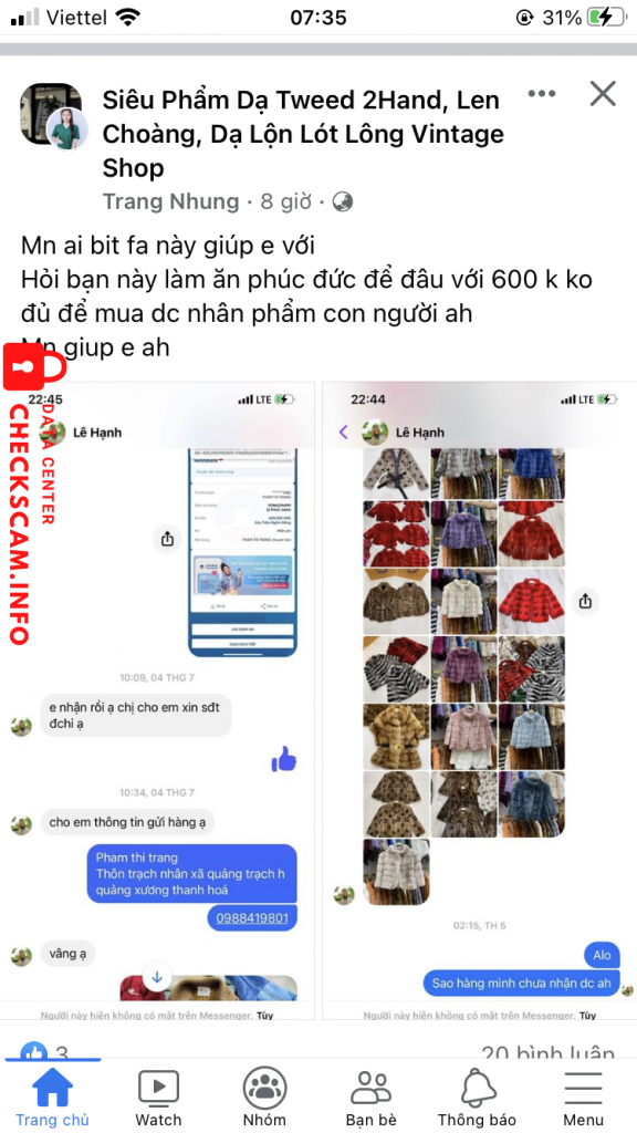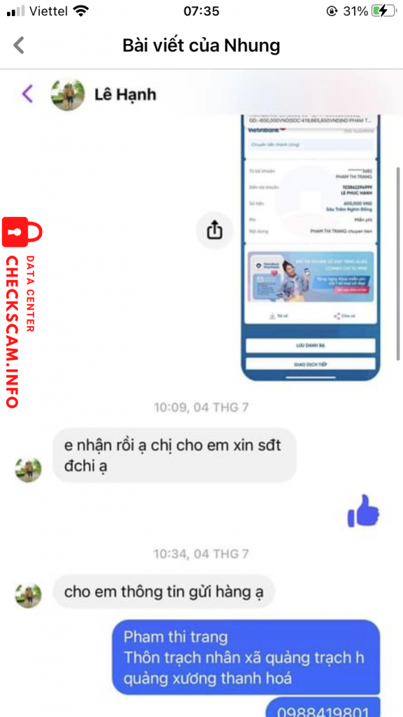 诈骗者警报: 103862294999 已报告: November 16, 2024 诈骗者信息 全名: 103862294999 支付网关: Vietinbank 支付账户: 103862294999 类别: 市场诈骗 来源: Checkscam 证据文件 报告描述 Bà này hay ở các group bán áo dạ tweed giá rẻ second hand, chuyển khoản xong thì bị block. mng lưu ý, mình lên đây check thì thấy tk vẫn sạch 评论 您的评论 添加评论 暂无评论。成为第一个分享您与此诈骗者经历的人。
