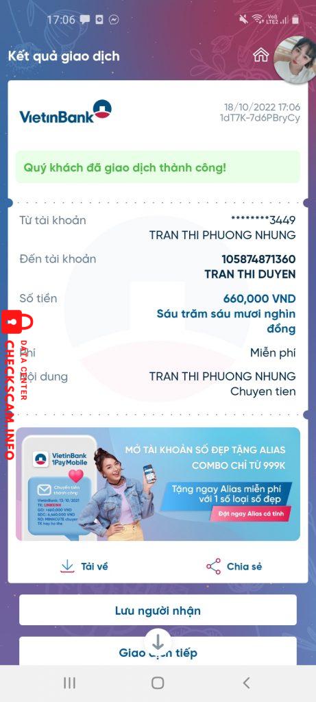 诈骗者警报: Trần Thị Duyên 已报告: November 16, 2024 诈骗者信息 全名: Trần Thị Duyên 支付网关: Vietinbank 支付账户: 105874871360 类别: 市场诈骗 来源: Checkscam 证据文件 报告描述 Lừa mua voucher giảm giá từ các nhãn hàng rồi chặn tin nhắn, rất nhiều bạn bị giống trường hợp này 评论 您的评论 添加评论 暂无评论。成为第一个分享您与此诈骗者经历的人。
