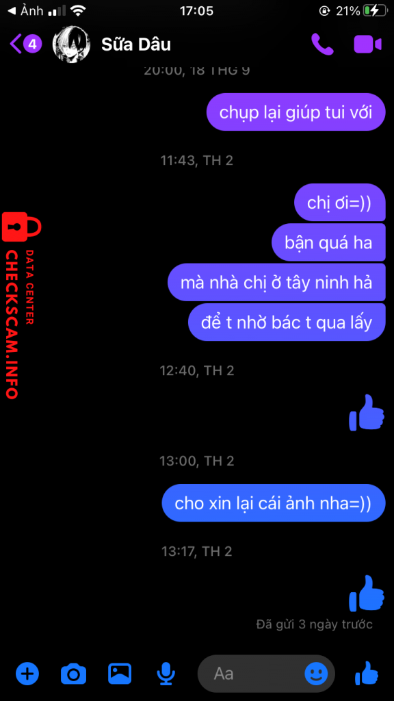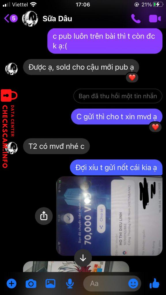 诈骗者警报: Ho thi dieu linh 已报告: November 16, 2024 诈骗者信息 全名: Ho thi dieu linh 电话号码: 0983861324 支付网关: Vietinbank 支付账户: 107001922882 类别: 市场诈骗 来源: Checkscam 证据文件 报告描述 Khoá fb sau đó mở lại hứa sẽ rf, nhưng đã quá hạn và sủi tiếp 评论 您的评论 添加评论 暂无评论。成为第一个分享您与此诈骗者经历的人。