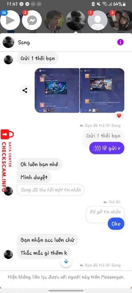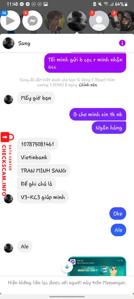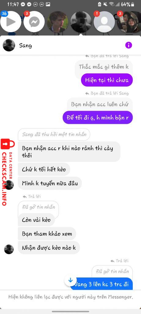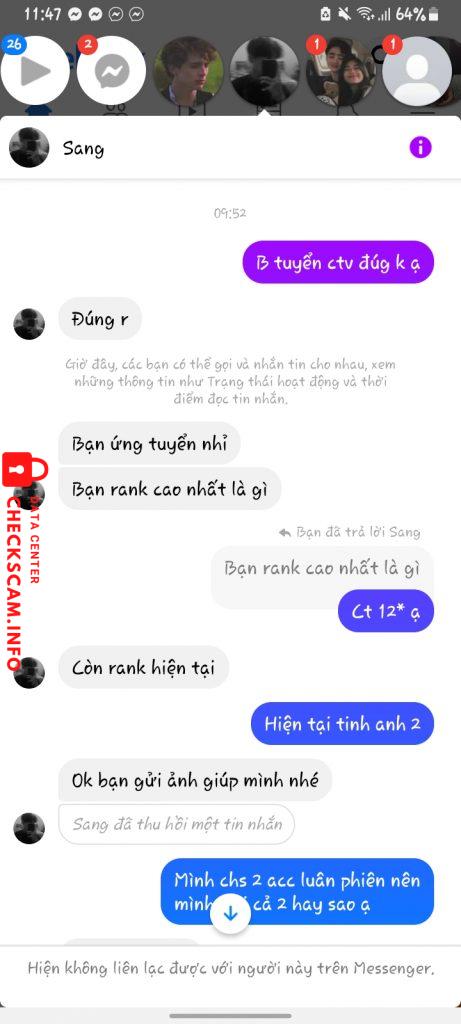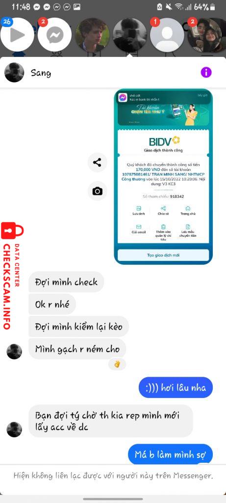 诈骗者警报: TRẦN MINH SANG 已报告: November 16, 2024 诈骗者信息 全名: TRẦN MINH SANG 电话号码: 0584926402 支付网关: Viettinbank 支付账户: 107875081461 类别: 市场诈骗 来源: Checkscam 证据文件 报告描述 Nó đăng bài tuyển cộng tác viên cày liên quân. Bảo nhận kèo xong chuyển khoản để cọc cho nó để nó đưa acc khách. Nó còn xin cả stk ngân hàng mình vs zalo rồi nó mới block ạ 评论 您的评论 添加评论 暂无评论。成为第一个分享您与此诈骗者经历的人。