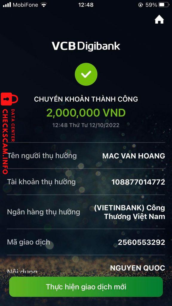 诈骗者警报: MAC VAN HOANG 已报告: November 16, 2024 诈骗者信息 全名: MAC VAN HOANG 电话号码: 0904026940 支付网关: Vietin Bank 支付账户: 108877014772 类别: 市场诈骗 来源: Checkscam 证据文件 报告描述 Thằng này bán ipad xong lừa cọc tiền… Nó có chiêu trò sẽ bảo mình gửi cod k được, do bị bên chuyển phát hạn chế số tiền cod, r bảo mình gửi tiền bù cho nó gửi cod được. Nhẹ dạ quá nên em bị lừa mất tiền oan 评论 您的评论 添加评论 暂无评论。成为第一个分享您与此诈骗者经历的人。