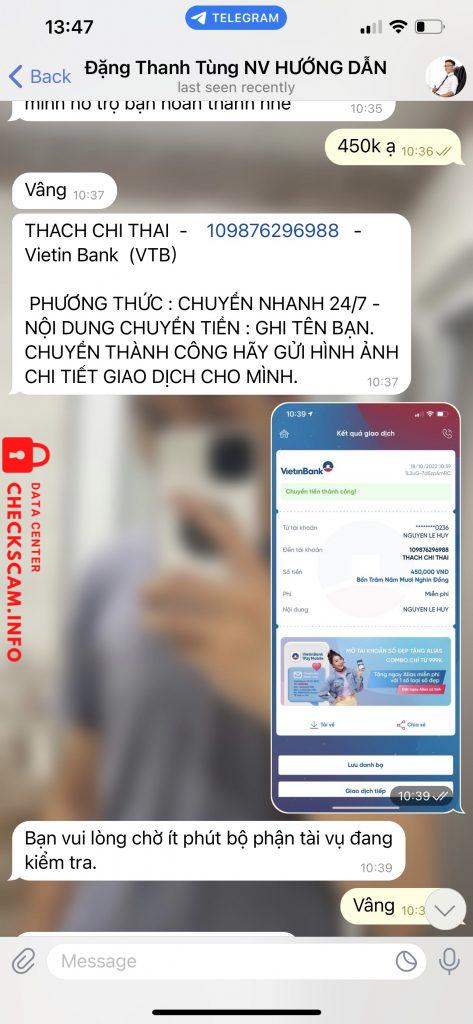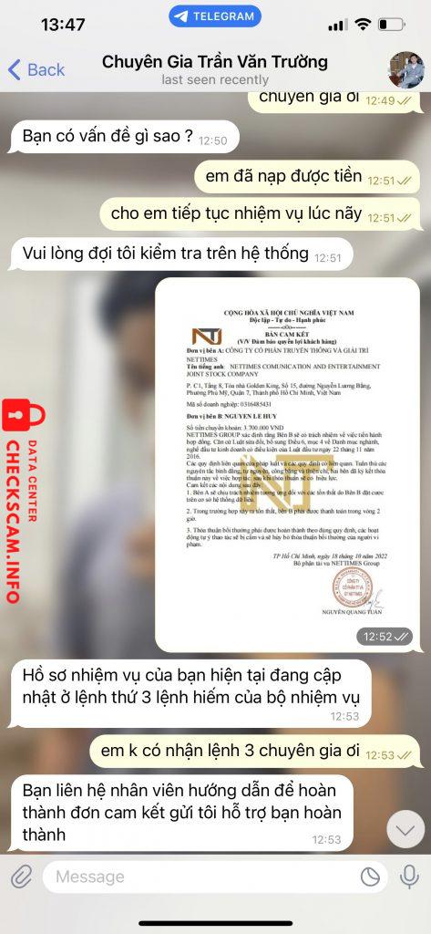 Có 1 nhóm lừa đảo bên telegram lừa đảo theo phương thức mời chào làm nhiệm vụ tăng tương tác bài hát cho zing nhận hoa hồng để lấy lòng tin của người bị hại sau đó đưa ra các nhiệm vụ nạp tiền để nhận 30 – 50% hoa hồng mình đã bị lừa nạp vào 2 lần. Lần 1 450k lần 2 3700k tổng cộng 4150k và tiếp tục yêu cầu mình phải nạp thêm 16tr800k để nhận lại tiền gốc. Sau khi mình phát hiện lừa đảo thì gọi điện chửi bới và đe doạ.