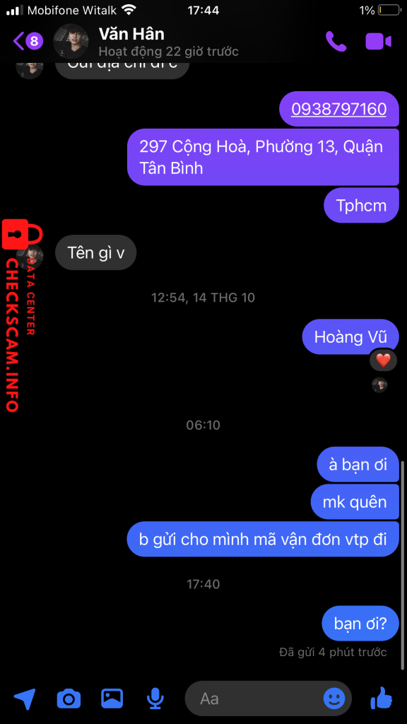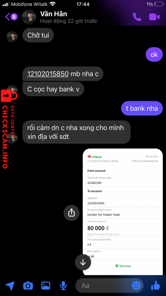 诈骗者警报: HUYNH THI THANH THAO 已报告: November 16, 2024 诈骗者信息 全名: HUYNH THI THANH THAO 支付网关: MB Bank 支付账户: 12102015850 类别: 市场诈骗 来源: Checkscam 证据文件 报告描述 Nhắn tin ko trả lời, ko còn tìm thấy đc tài khoản trên facebook. Do thấy đối tượng đã là một thành viên trong một group bán truyện tgian dài và đã gd với 1 vài bạn k ngờ lần này lại bị scam 评论 您的评论 添加评论 暂无评论。成为第一个分享您与此诈骗者经历的人。