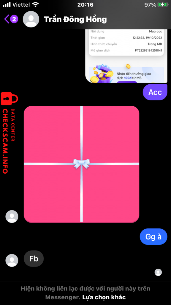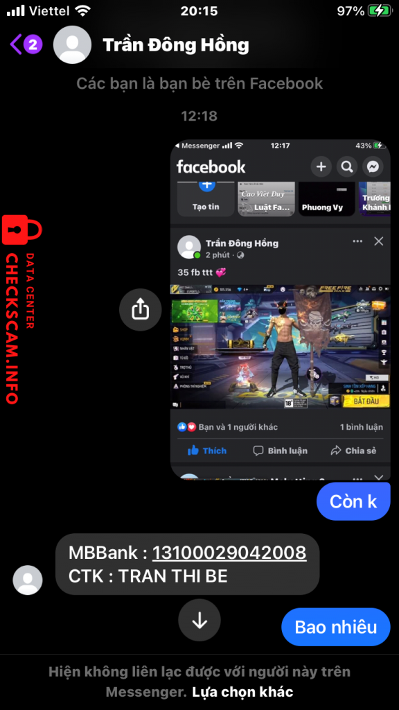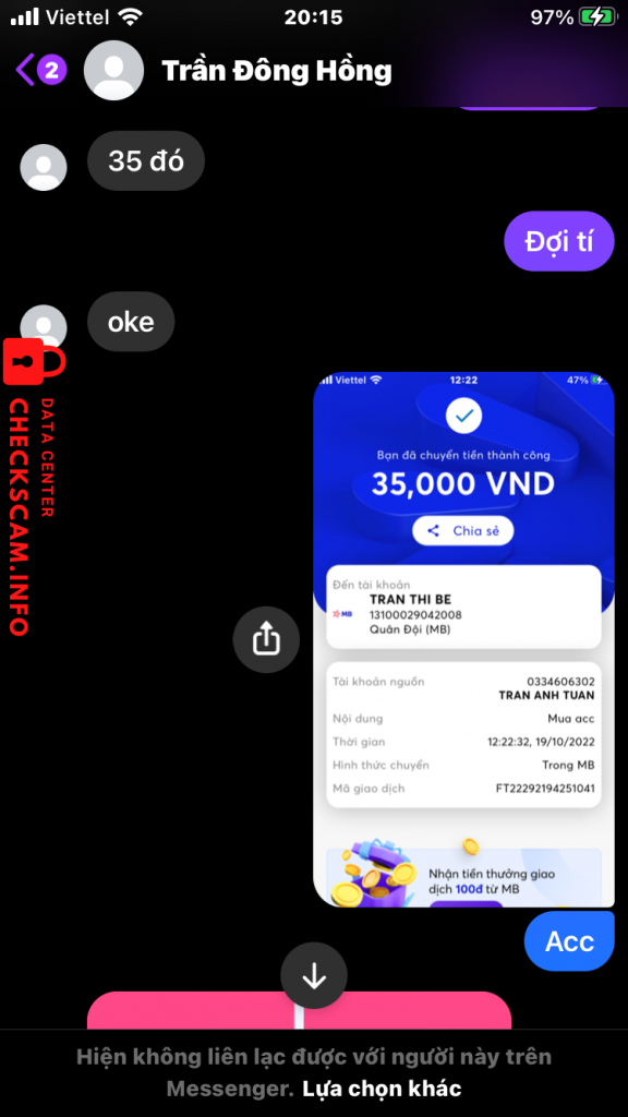 诈骗者警报: TRAN THI BE 已报告: November 16, 2024 诈骗者信息 全名: TRAN THI BE 支付网关: MBBANK 支付账户: 13100029042008 类别: 市场诈骗 来源: Checkscam 证据文件 报告描述 Đã chuyển tiền rồi đưa tk mk xong chặn luôn 评论 您的评论 添加评论 暂无评论。成为第一个分享您与此诈骗者经历的人。