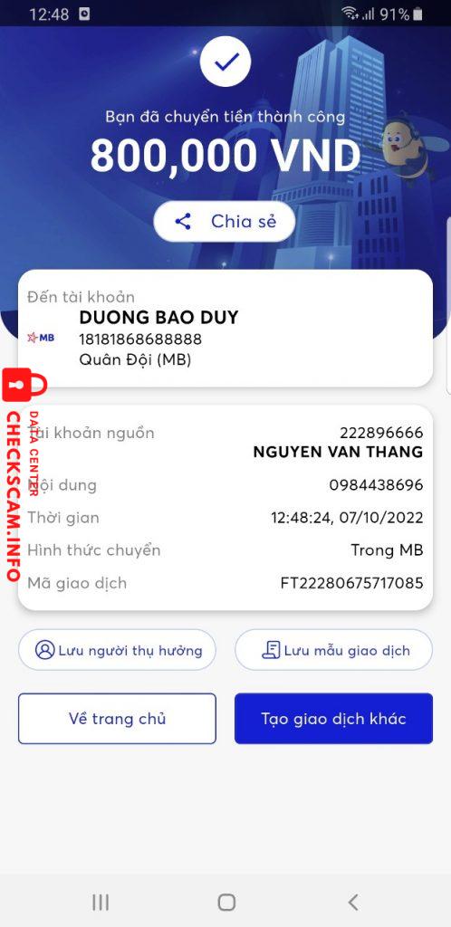 诈骗者警报: Duong bao duy 已报告: November 16, 2024 诈骗者信息 全名: Duong bao duy 支付网关: Ngân hàng quân đội MB 支付账户: 18181868688888 类别: 市场诈骗 来源: Checkscam 证据文件 报告描述 Tôi đăng ký gói cước gọi nội và ngoại mạng viettel thời gian 12 tháng với giá 800000đ, chuyển khoản xong và được thông báo là ngày hôm sau sẽ xong. Hôm sau thì tôi bị chặn tài khoản facebook và thu hồi hết đoạn chat. Tài khoản thì chưa được đăng ký. 评论 您的评论 添加评论 暂无评论。成为第一个分享您与此诈骗者经历的人。