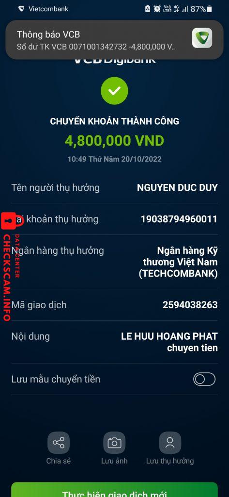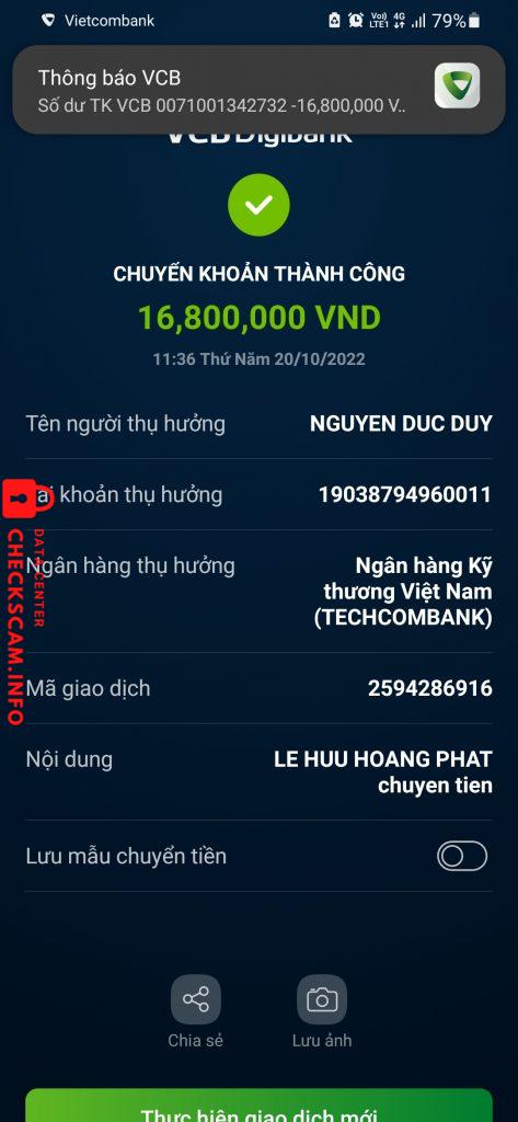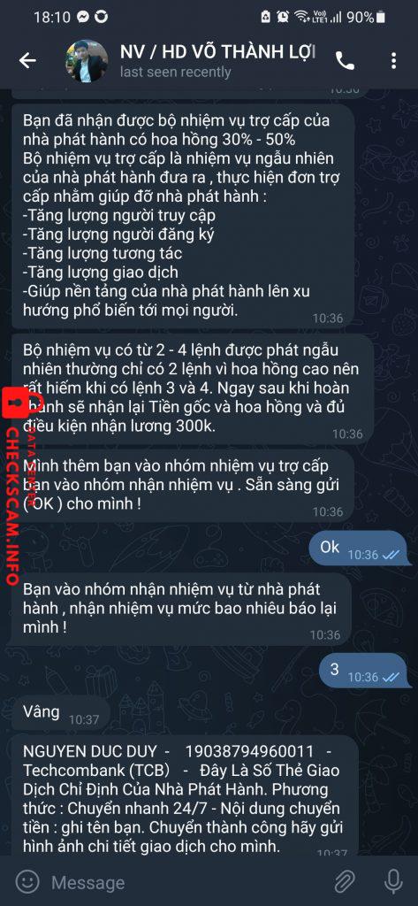 诈骗者警报: Nguyễn Đức Huy 已报告: November 16, 2024 诈骗者信息 全名: Nguyễn Đức Huy 电话号码: 0989751925 支付网关: Techcombank 支付账户: 19038794960011 类别: 市场诈骗 来源: Checkscam 证据文件 报告描述 Lừa đảo telegram gọi làm nhiệm vụ. Ban đầu sẽ cò mồi làm thấp xong dần dần sẽ tăng lên từ 410k rồi đến 4tr5 xong rồi đến 16tr8 kêu là ăn hoa hồng. Thái độ của bọn này rất là lòi lõm mọi người cẩn thận 评论 您的评论 添加评论 暂无评论。成为第一个分享您与此诈骗者经历的人。
