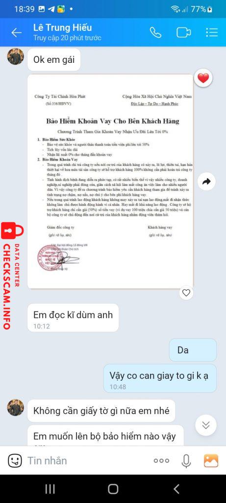 Lừa đảo đảo vay tien.phải bắt đóng phi.bảo hiểm tum lum hết.rồi moi giai ngan cho .hoan vốn lai so tien da.đóng phí.nhung khi gui xong hết so tien la bắt phải chup giấy công chứng Đất de duyệt. Thi moi biết bi lừa nen tôi đã k gui nua .va đã chặn số zalo tất cả. Mong moi người đừng de bi lừa như tôi.