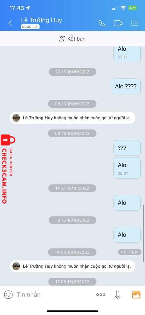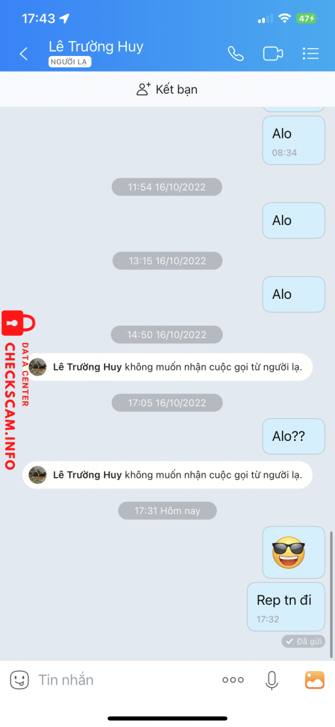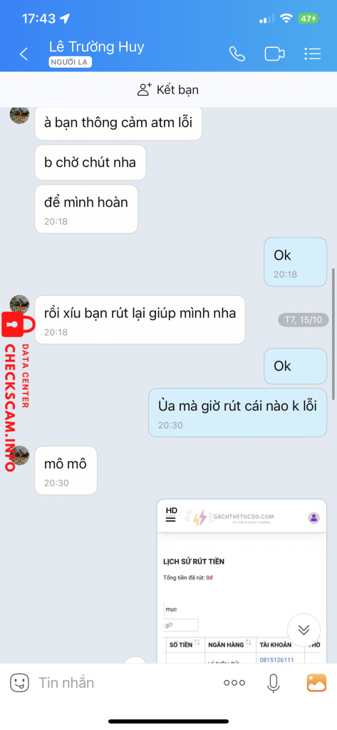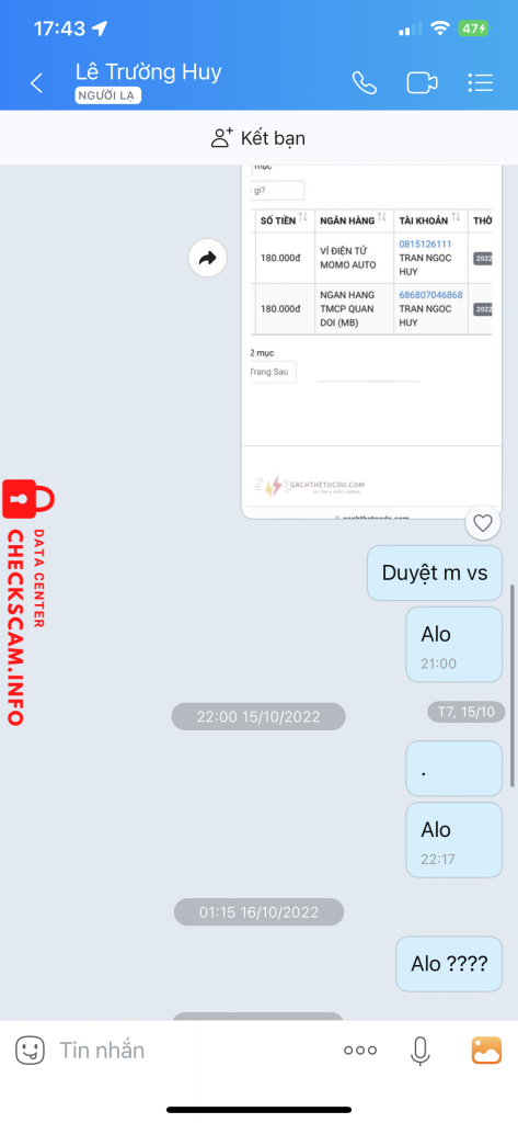 诈骗者警报: Lê Trường Huy 已报告: November 16, 2024 诈骗者信息 全名: Lê Trường Huy 电话号码: 0923533108 支付网关: MB Bank 支付账户: 230120788888 类别: 市场诈骗 来源: Checkscam 证据文件 报告描述 Web scam gạch thẻ – Gachthetocdo.com site nuốt thẻ rút không cho liên hệ không được mọi người nên né thật xa ạ 评论 您的评论 添加评论 暂无评论。成为第一个分享您与此诈骗者经历的人。