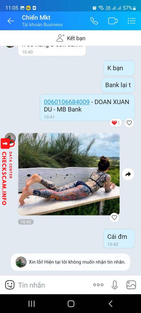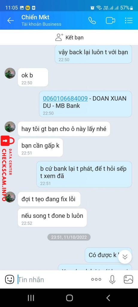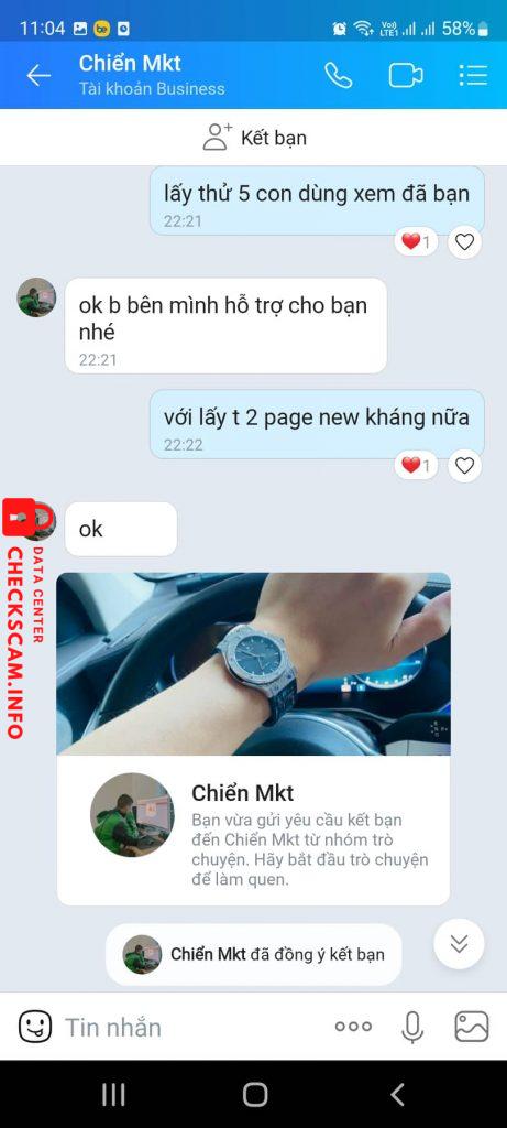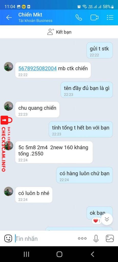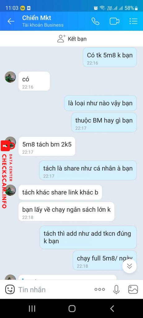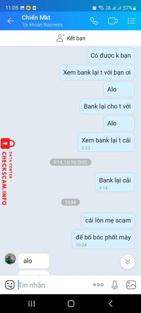 Vào tối hôm qua tôi có hỏi mua tài khoản 5m8 của người có zalo tên Chiến Mkt trên nhóm zalo. 2 bên giao dịch riêng trên zalo và không trung gian. Tôi đã bank tiền trước cho Chiến và đợi Chiến giao hàng. Nhưng 1 lúc sau Chiến nói là máy tính hỏng, cần fix nên k giao hàng được. Chiến nói đợi 1 lúc khi fix xong máy tính thì sẽ giao hàng cho tôi. Nhưng tôi đợi 2 tiếng k thấy Chiến nhắn lại. Tôi đã nhắn nhiều tin yêu cầu hoàn tiền nhưng Chiến chỉ xem mà k rep. Đến sáng nay Chiến đã chính thức block tôi trên Zalo. Đây chính xác là 1 vụ scam, ae tranh thằng ml này ra nhé.