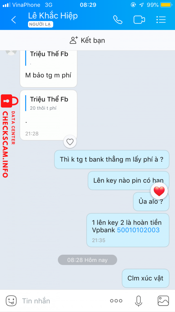 诈骗者警报: Lê Khắc Hiệp (SV) 已报告: November 16, 2024 诈骗者信息 全名: Lê Khắc Hiệp (SV) 支付网关: MBANK 支付账户: 6999996966 类别: 市场诈骗 来源: Checkscam 证据文件 报告描述 Lừa đảo bán Box zalo giá 20.000 VND. Bank tiền xong im luôn nhắn tin thì không rep sau đó kick tôi ra khỏi toàn bộ box của hắn. Mong ad duyệt để mọi người biết và tránh xa hắn. 评论 您的评论 添加评论 暂无评论。成为第一个分享您与此诈骗者经历的人。