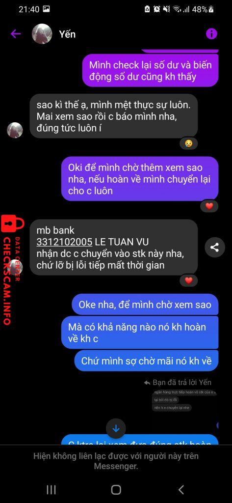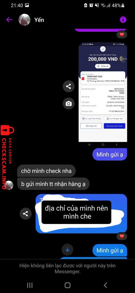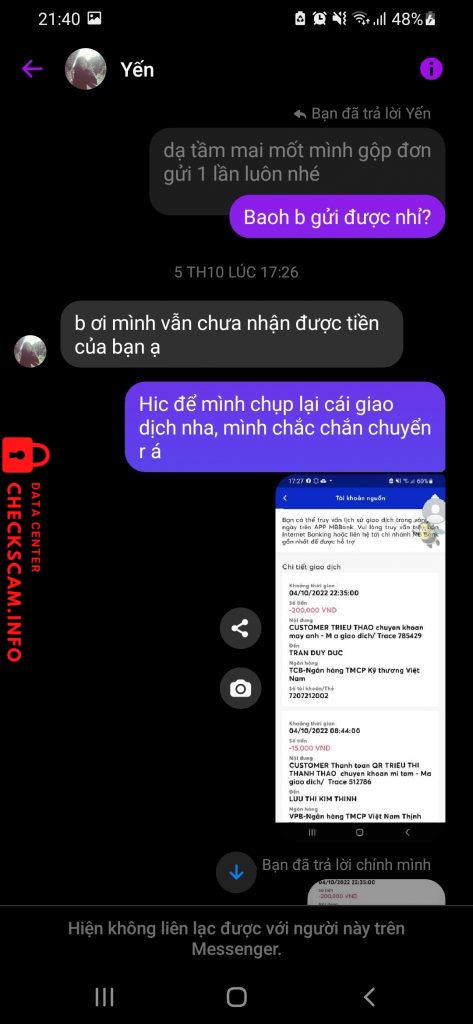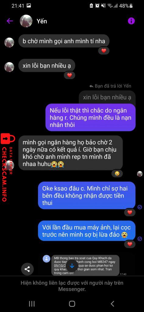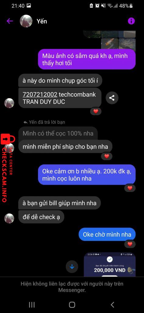 Mình có mua máy ảnh của 1 bạn trong gr “máy ảnh compact du lịch” trên fb. Lần đầu mua chưa có kinh nghiệm+ chủ quan và thấy giá rẻ nên mình chuyển tiền luôn 200k mà chưa check. Chuyển xong nó bảo chưa nhận được, mấy ngày sau nó vẫn rep mình và bảo chưa nhận được. Nghi nghi rồi nhưng mình vẫn sợ lỗi do ngân hàng nên làm việc với ngân hàng bao lâu. Cuối cùng thì nó lừa thiệc. Má lần đầu mua máy ảnh cũng là lần đầu dính scam luôn. Mình phát hiện ra nhiều người trong gr cũng bị nó lừa. Mọi người cảnh giác nha, nó còn có 1 stk nữa tên