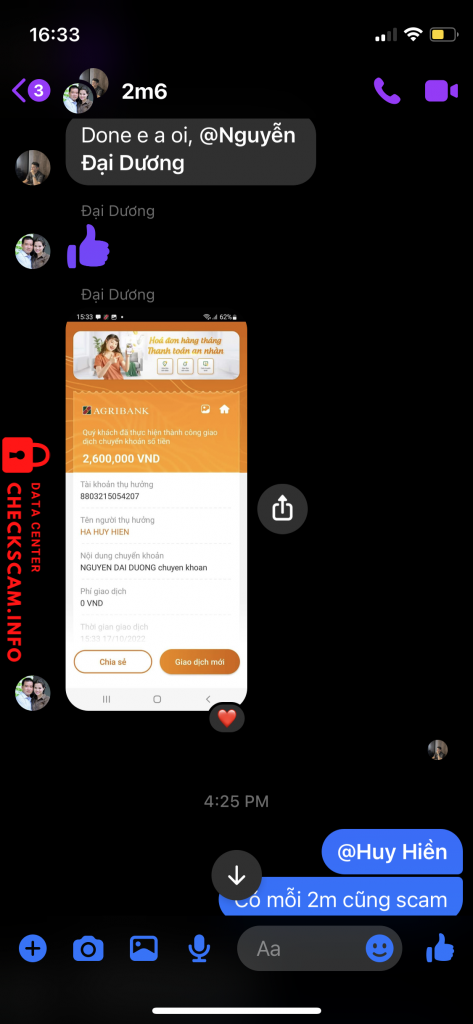 诈骗者警报: Ha Huy Hien 已报告: November 16, 2024 诈骗者信息 全名: Ha Huy Hien 支付网关: Agribank 支付账户: 8803215054207 类别: 市场诈骗 来源: Checkscam 证据文件 报告描述 Đã trung gian giao dịch tài khoản sau khi done giao dịch đã back lại tk ngay lập tức 评论 您的评论 添加评论 暂无评论。成为第一个分享您与此诈骗者经历的人。