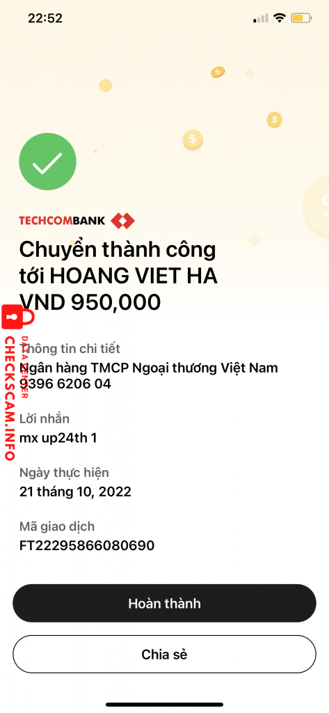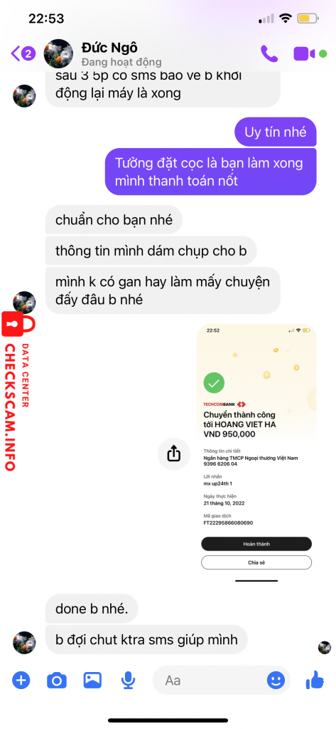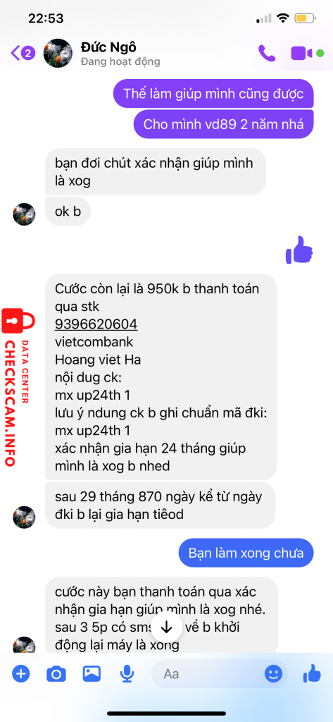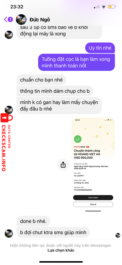 诈骗者警报: Hoang Viet Ha 已报告: November 16, 2024 诈骗者信息 全名: Hoang Viet Ha 支付网关: Vietcombank 支付账户: 9396620604 类别: 市场诈骗 来源: Checkscam 证据文件 报告描述 Lừa làm gói cước các mạng vinaphone, viettel, mobiphone. Hình thức đòi chuyển khoản trước rồi chặn nick 评论 您的评论 添加评论 暂无评论。成为第一个分享您与此诈骗者经历的人。