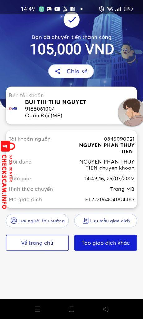 诈骗者警报: Bui Thi Thu Nguyet 已报告: November 16, 2024 诈骗者信息 全名: Bui Thi Thu Nguyet 支付网关: Mb 支付账户: 9188061004 类别: 市场诈骗 来源: Checkscam 证据文件 报告描述 Lừa ứng tiền chuyển khoản 评论 您的评论 添加评论 暂无评论。成为第一个分享您与此诈骗者经历的人。