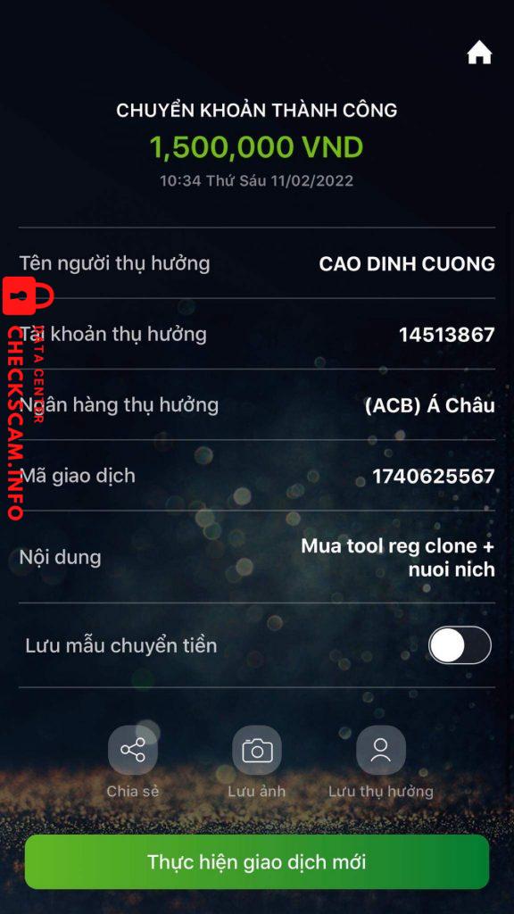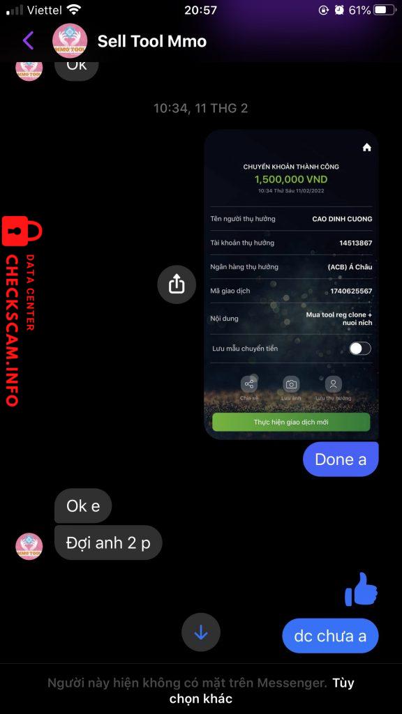诈骗者警报: Cao đình cường 已报告: November 16, 2024 诈骗者信息 全名: Cao đình cường 电话号码: 0763063484 支付网关: acb 支付账户: 14513867 类别: 市场诈骗 来源: Checkscam 证据文件 报告描述 mua tool reg facebook nhưng ko cài đặt đã bị chặn mes 评论 您的评论 添加评论 暂无评论。成为第一个分享您与此诈骗者经历的人。