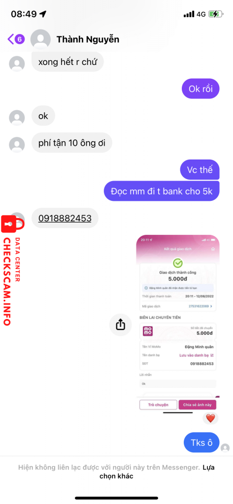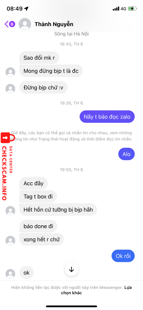诈骗者警报: Đặng Minh Tân 已报告: November 16, 2024 诈骗者信息 全名: Đặng Minh Tân 电话号码: 0918882453 支付网关: Momo 支付账户: 0918882453 类别: 市场诈骗 来源: Checkscam 证据文件 报告描述 Bán acc xong back lại 评论 您的评论 添加评论 暂无评论。成为第一个分享您与此诈骗者经历的人。