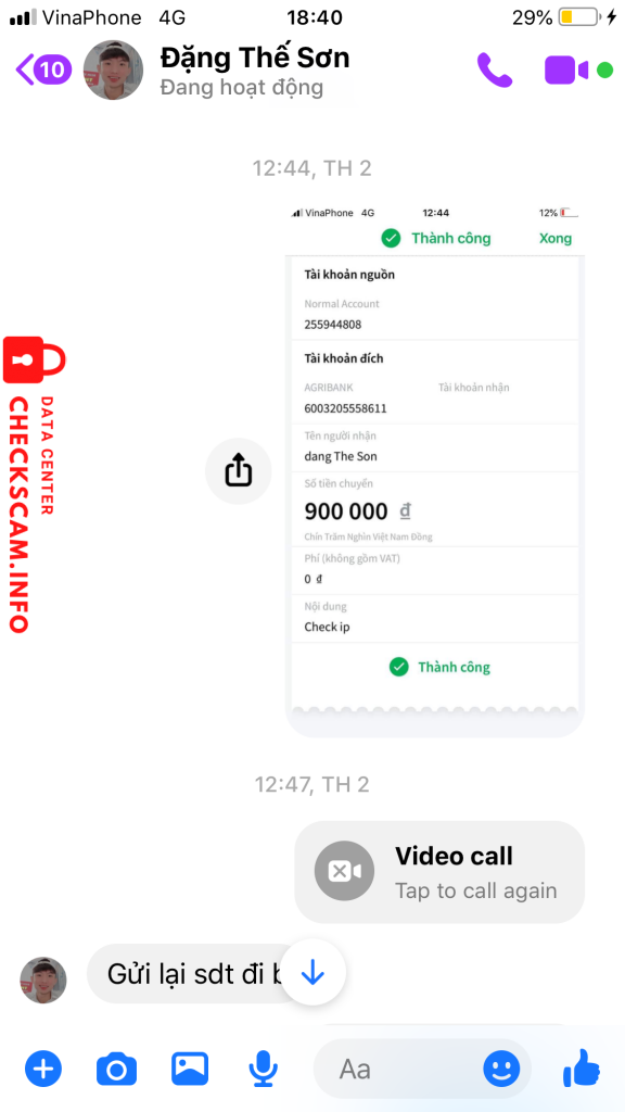 诈骗者警报: Đặng thế sơn 已报告: November 16, 2024 诈骗者信息 全名: Đặng thế sơn 电话号码: 0382019480 支付网关: Agribank 支付账户: 6003205558611 类别: 市场诈骗 来源: Checkscam 证据文件 报告描述 Bố thí cho Tk mặt lzzz này cho cha mẹ m đắp bia mộ sớm 评论 您的评论 添加评论 暂无评论。成为第一个分享您与此诈骗者经历的人。