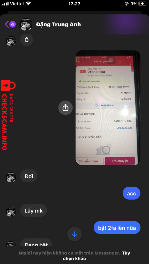 诈骗者警报: Đặng Trung Anh 已报告: November 16, 2024 诈骗者信息 全名: Đặng Trung Anh 电话号码: 0862927296 支付网关: MoMo 支付账户: 0862927296 类别: 市场诈骗 来源: Checkscam 证据文件 报告描述 Em có mua acc của bạn này.Lúc e bank tiền thì bạn ý bảo là đi lấy mk vs bật 2fa.Xong r bạn bắt e gửi thêm 20k nữa để lấy acc r em cũng đồng ý.Khi e gửi card xong thì ăn block :)) 评论 您的评论 添加评论 暂无评论。成为第一个分享您与此诈骗者经历的人。