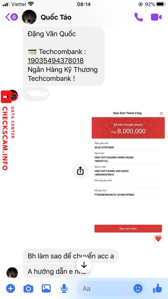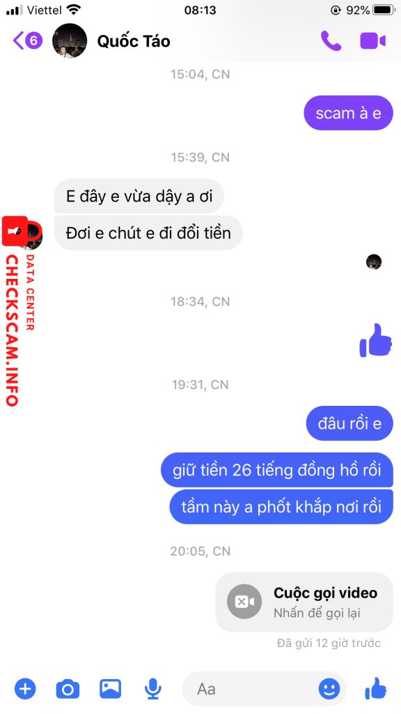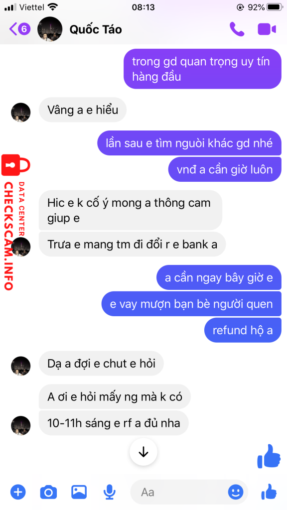 诈骗者警报: Đặng Văn Quốc 已报告: November 16, 2024 诈骗者信息 全名: Đặng Văn Quốc 电话号码: 0838431111 支付网关: techcombank 支付账户: 19035494378018 类别: 市场诈骗 来源: Checkscam 证据文件 报告描述 kẻ lừa đảo giao dịch 1-2 lần sòng phẳng sau đó lừa chuyển 160tr, nhận được tiền chặn mọi liên lạc 评论 您的评论 添加评论 暂无评论。成为第一个分享您与此诈骗者经历的人。