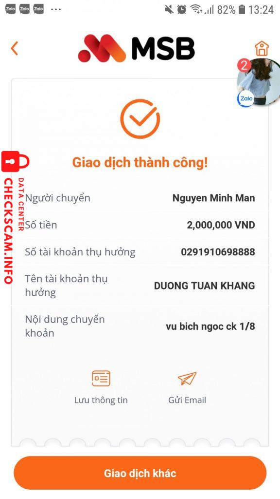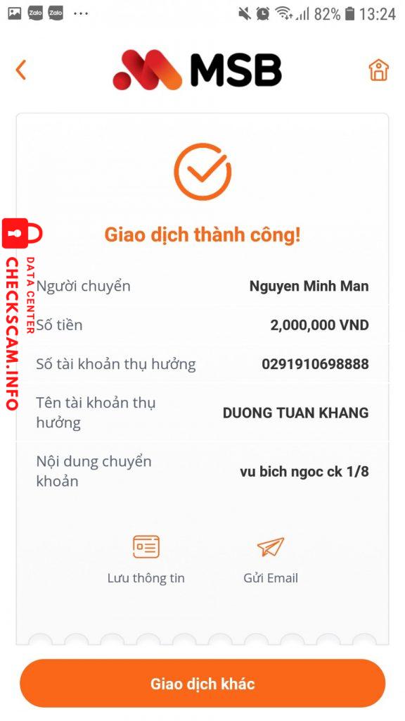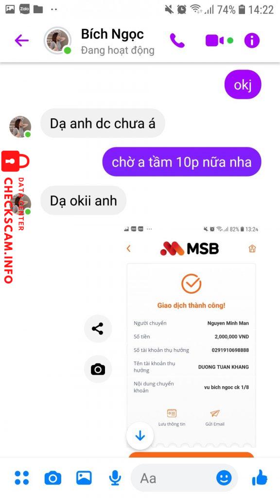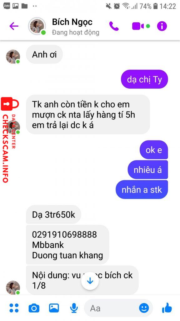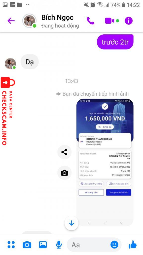 诈骗者警报: Duong Tuan Khang 已报告: November 16, 2024 诈骗者信息 全名: Duong Tuan Khang 支付网关: MB Bank 支付账户: 0291910698888 类别: 市场诈骗 来源: Checkscam 证据文件 报告描述 Ngày 1/8/2022 tài khoản Messenger của em họ tôi tên là Vũ Bích Ngọc bị hack và mượn tiền tôi tổng số tiền là 3tr650. 评论 您的评论 添加评论 暂无评论。成为第一个分享您与此诈骗者经历的人。