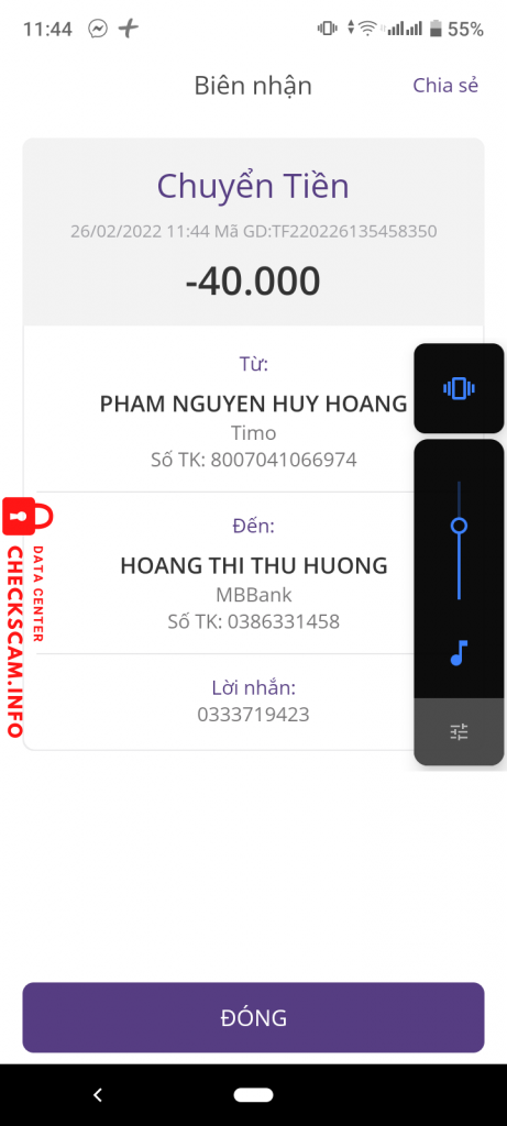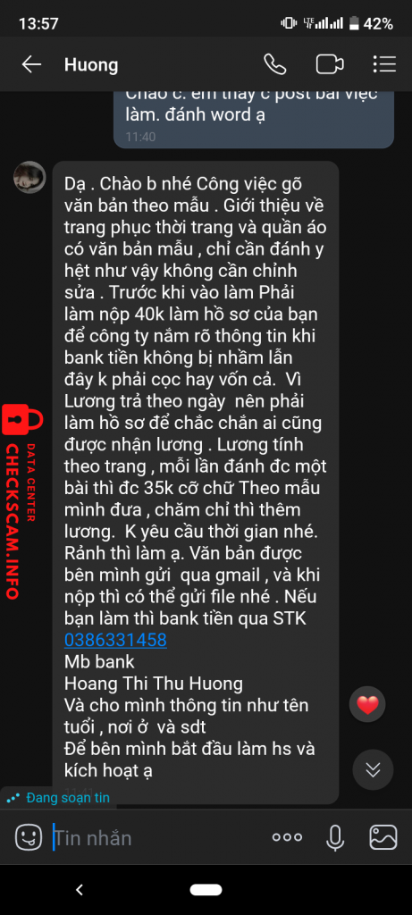 诈骗者警报: HOANG THI THU HUONG 已报告: November 16, 2024 诈骗者信息 全名: HOANG THI THU HUONG 支付网关: MB Bank 支付账户: 03860331458 类别: 市场诈骗 来源: Checkscam 证据文件 报告描述 Scam tuyển người đánh word bắt nộp phí trước 40k sau đó đòi thêm phát sinh 150k kích hoạt gì đó. Nếu nộp thêm sẽ phát sinh tiếp. 评论 您的评论 添加评论 暂无评论。成为第一个分享您与此诈骗者经历的人。