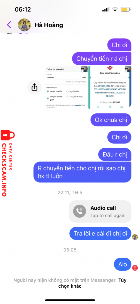 诈骗者警报: Hoang Viet Ha 已报告: November 16, 2024 诈骗者信息 全名: Hoang Viet Ha 支付网关: Vietcombank 支付账户: 0351000934382 类别: 市场诈骗 来源: Checkscam 证据文件 报告描述 Cẩn thận nha mn nó lừa xong nó chặn fb thứ ăn ở thất đức 评论 您的评论 添加评论 暂无评论。成为第一个分享您与此诈骗者经历的人。