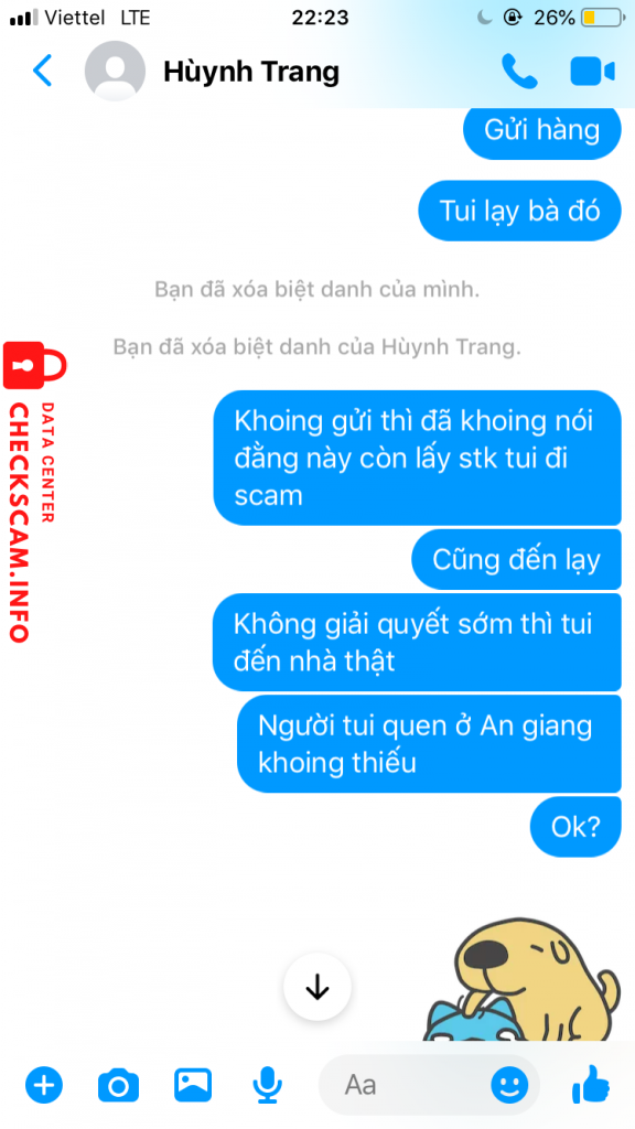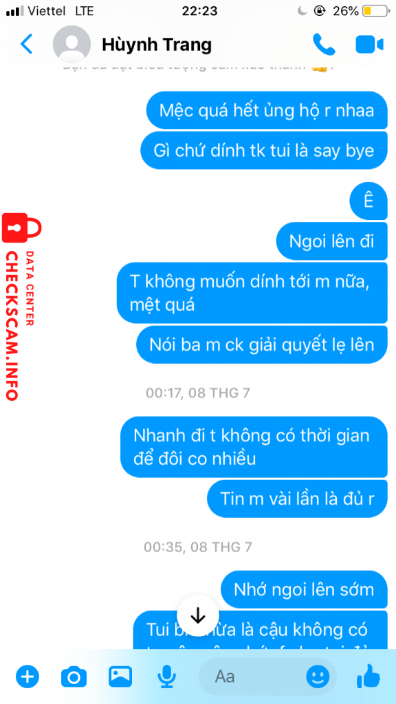 Em gái nó là Huỳnh Thị Phương Trang đi lừa tuii tui Bill tổng hơn 8 triệu rồi. Thủ đoạn lừa đảo tin vi, nhờ giữ và ckh nên không ai biết stk của nó. Nhưng 1 đoạn chat nó chụp đã khiến cho nó tự huỷ. Mong ad hãy up lên để mọi người cùng cảnh giác Huỳnh Thị Phương Trang.